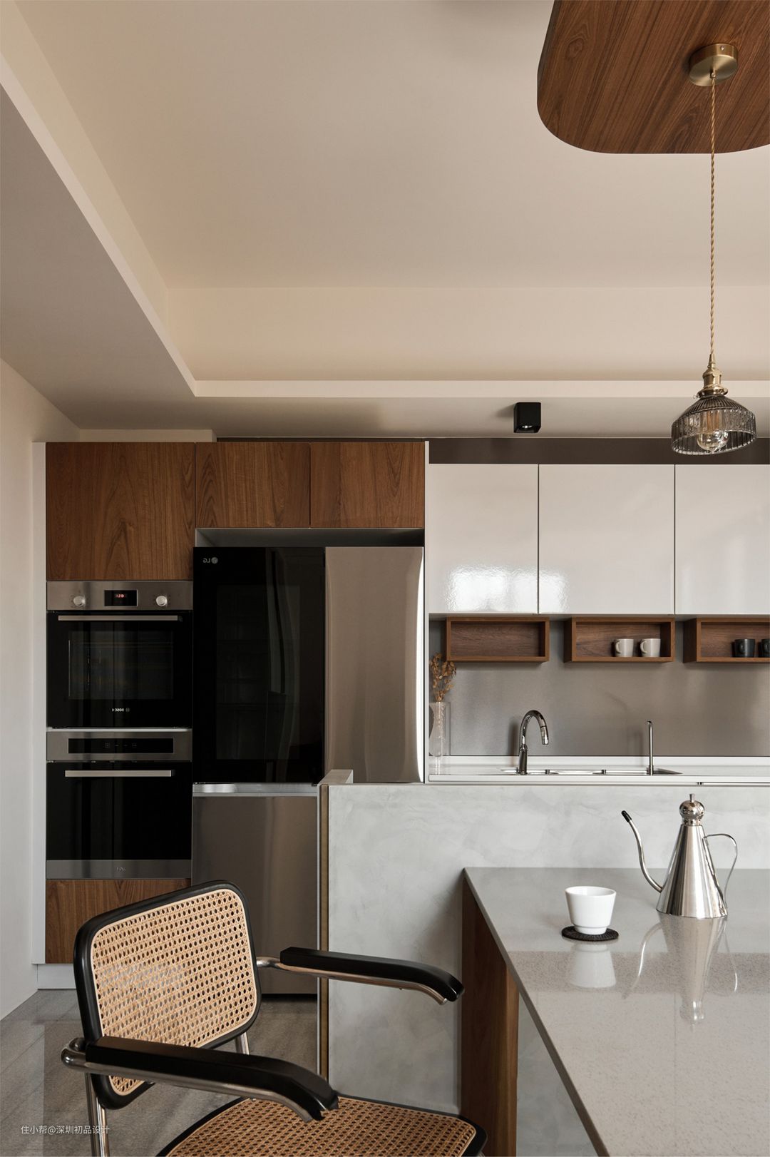 厨房原始墙体拆除。空间做一字型橱柜,在洗切炒的操作顺序上更加满足做饭的步骤。整体空间以现代感为主,材质上选用温润的瓷砖和白色原木。