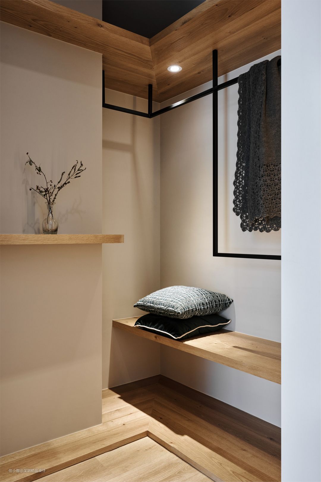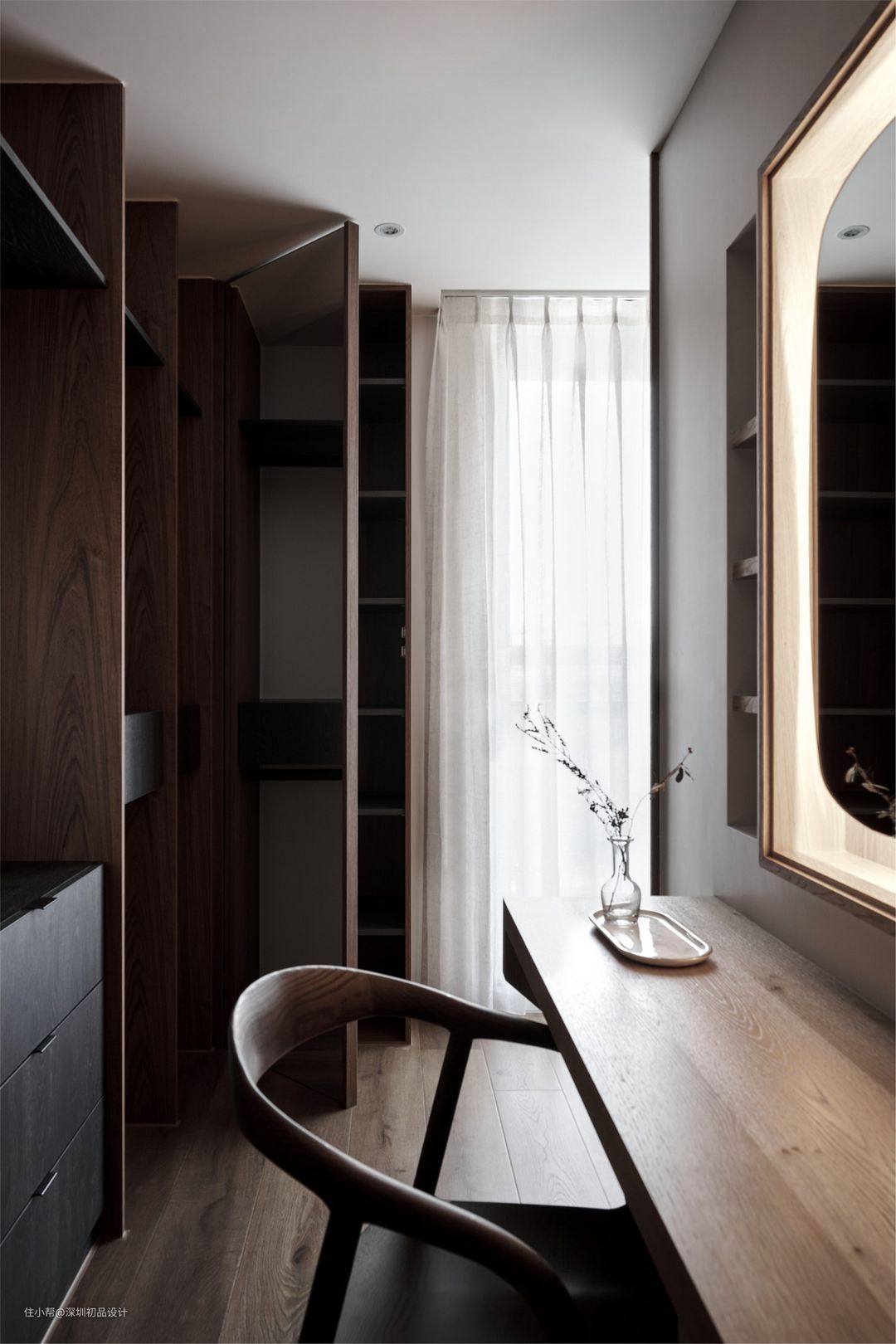 微水泥的背景墙,内嵌的壁龛和灯带点缀,以及一侧弧形转角的处理,简单的搭配使得空间融洽,无主灯带为整个空间增加光彩。温馨的色彩让情绪得到舒缓,软装上的搭配烘托氛围整个空间都展现出温馨。 衣帽间的设计和配色保留了简约的大气感,还兼备古典与现代的美感,开放式布局,通铺的木地板将空间衔接,统一性更强。空间布置比较简约大气,化妆台一体化布局,实现空间的最大化利用,实用性超强,巧妙提升生活品质感,用一间房来安放自己的爱好,为平淡生活添点小确幸。