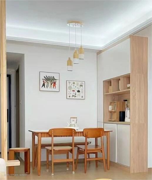 原木色和白色的餐桌自然浑成一体,空间实用大气。