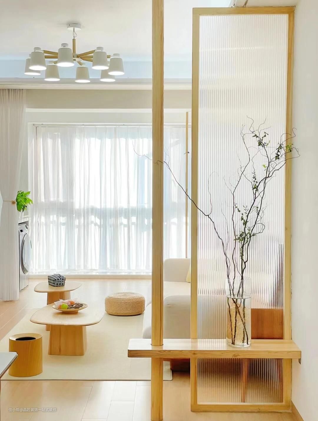 客厅里,色彩的沉静和木材的质朴共生,天花留白轻盈悬浮,平衡沉静稳重的质感。软糯沙发为客厅增加了温馨和柔美,不规则原木茶几自然有趣。客厅餐厅过道处用玻璃做隔断,不遮光还能保护隐私。