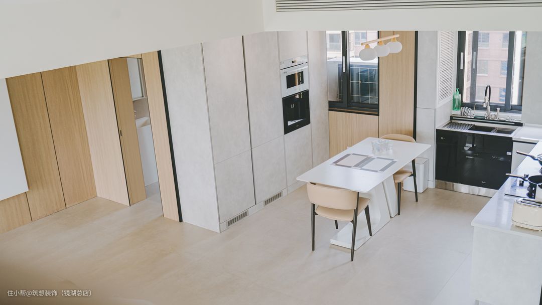 餐厅与厨房连在一起,在保障各自功能的同时也并未影响各自的使用功能。白色岩板餐桌,搭配褐色皮革餐椅,彰显主人的品位。顶部采用筒灯进行补光,无需担心餐厅与厨房的光线问题。 餐边柜做的是顶柜设计,隐形的把手既美观又优雅;内嵌的烤箱又节省一部分的厨房空间,使得整体的美观性得到提升。