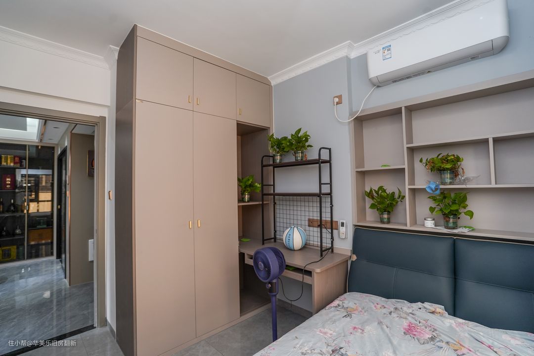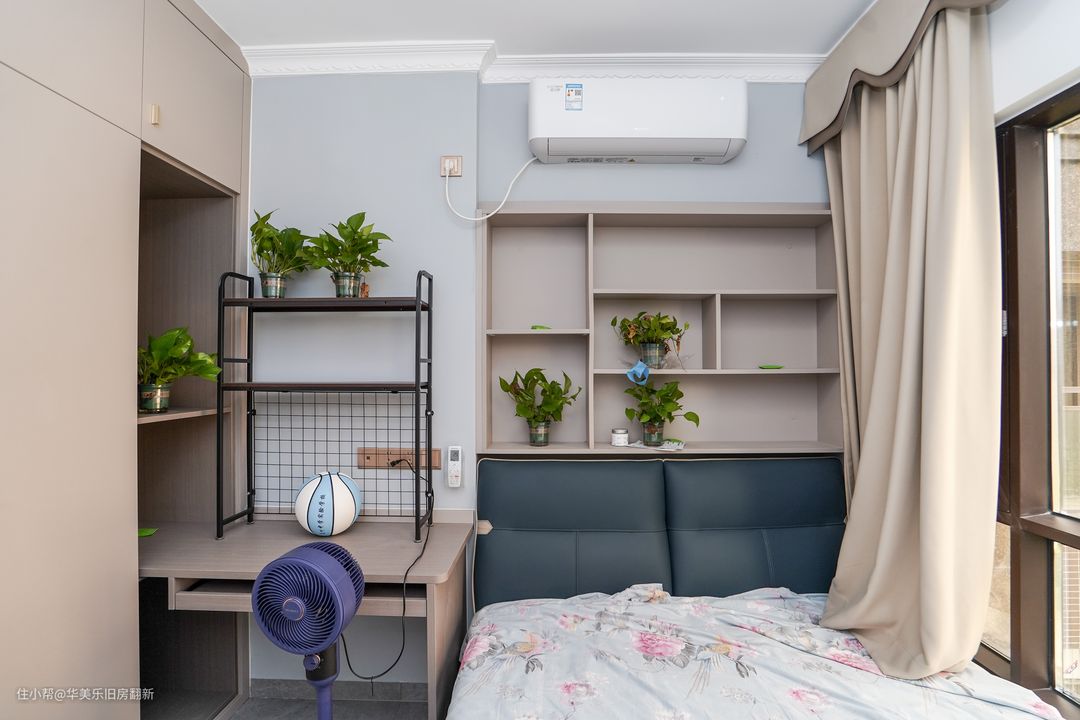 次卧将床榻尽量靠近窗户,以此来节省空间。没有地方安置床头柜,就在床头上方定制一个格子柜,可利用的空间比床头柜更灵活,装饰品,绿植和手机皆有不同规格的格子可以摆放,拿取也十分方便。