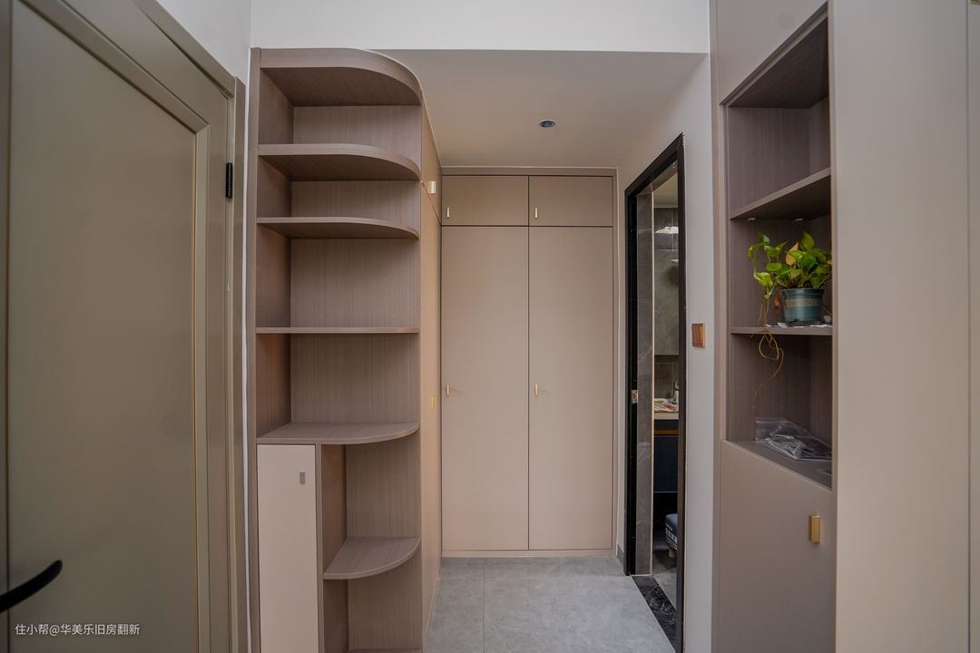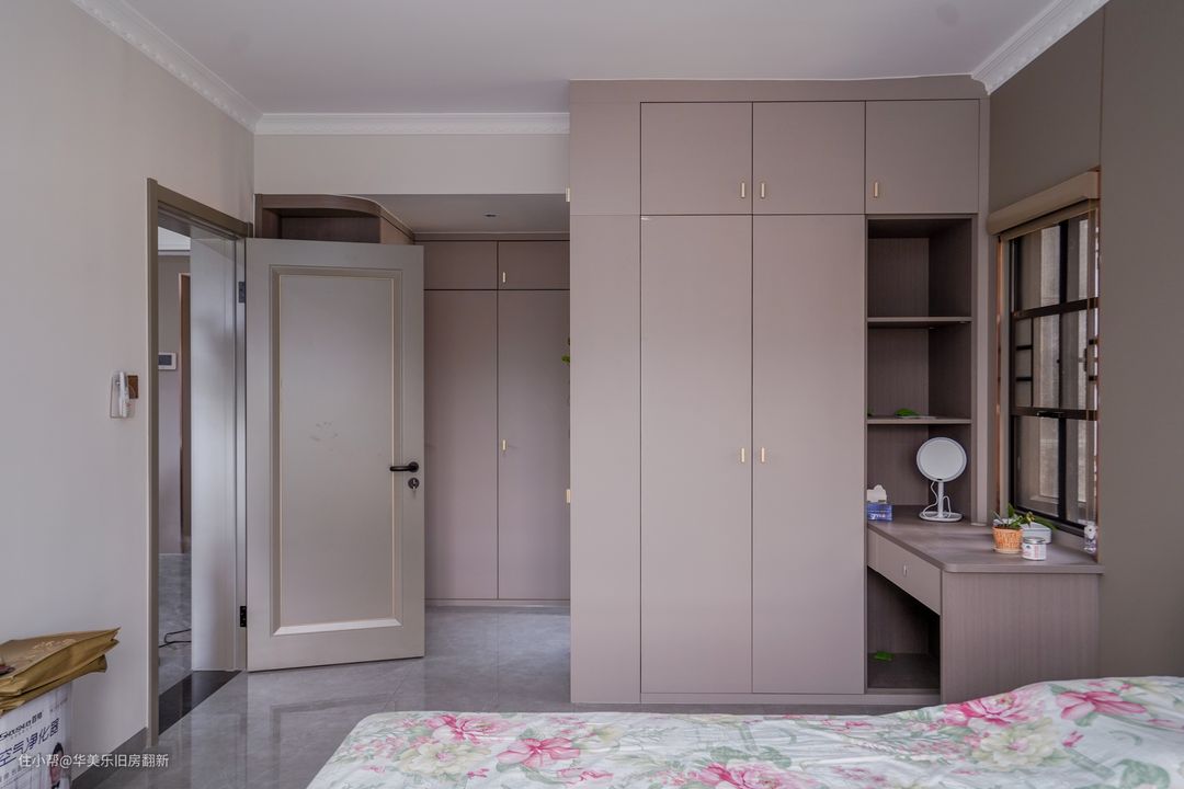 主卧的衣柜分别打造在两处墙体,一来是更合理地利用空间打造出更多柜体,满足夫妻二人的衣物收纳需求,二来双柜体的打造让衣物收纳能合理地进行分类,让生活起居井井有条。另外,梳妆柜与其中一个衣柜定制成一体柜,将更衣和梳妆的动线结合在一起,提高起居效率,女主人的实际体验也能更好。 独卫的空间比较小,因此没有进行干湿分离的设计,保留更多的可行动空间,特别是方便日常淋浴操作。
