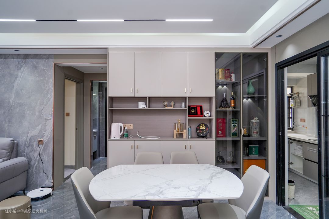 餐边柜是餐厅的重要组成部分,主体主要分为原木柜和玻璃柜两部分,上下的原木柜主打收纳,补充横厅的收纳能力,中部是饮水区满足生活起居需求,玻璃柜主要用来放置贵重酒品酒杯等,提升就餐环境的颜值与档次。