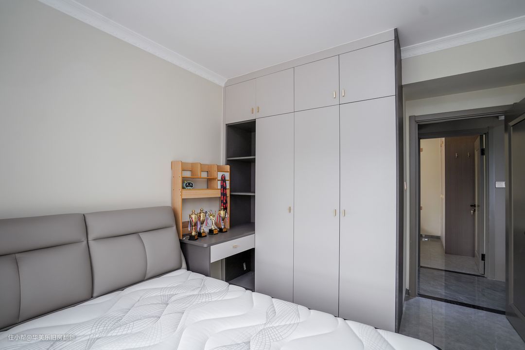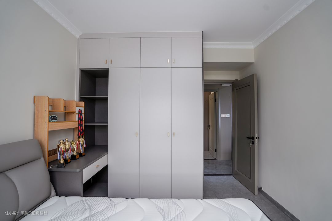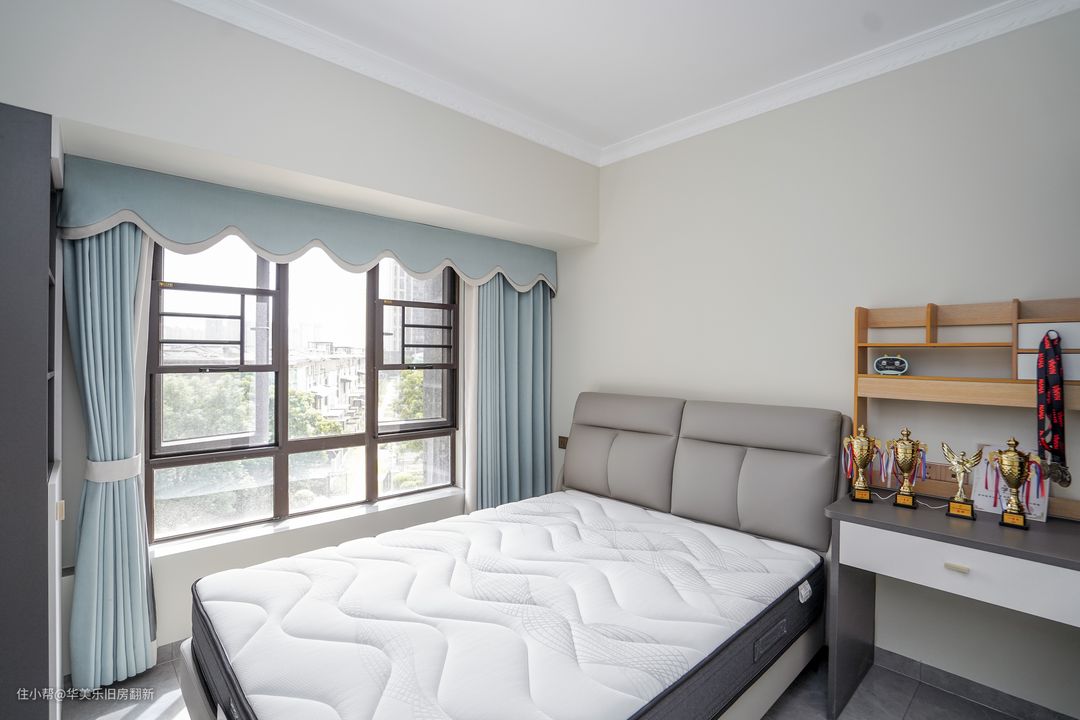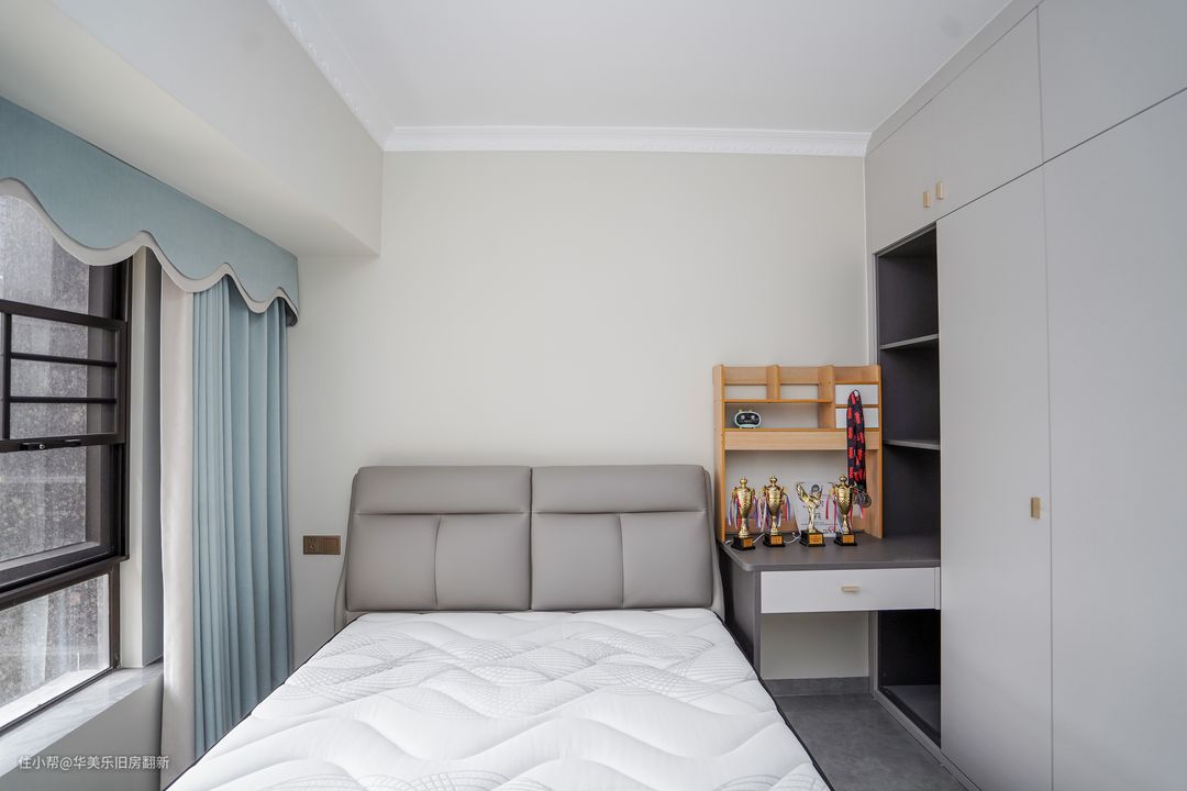 儿童房是经典灰白简约空间,窗帘换上了浅蓝色,给房间增添年轻与阳光的气息。整体布局与次卧相差不大,同样是将书桌和衣柜定制成一体柜,让更衣、学习和休息自然连成一条动线,且区域之间切换方便,能很好地帮助孩子养成合理的生活习惯,提升起居效率。