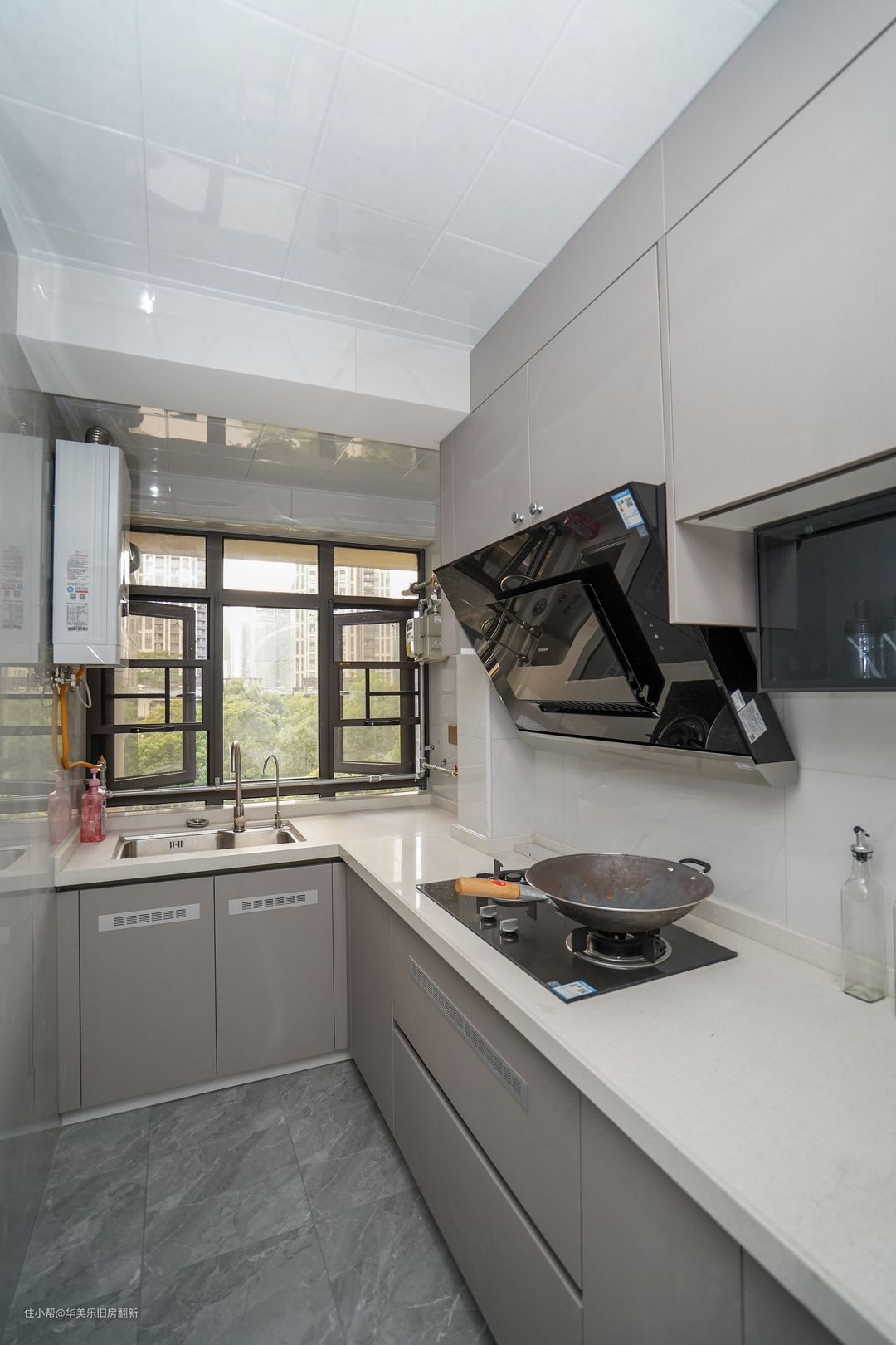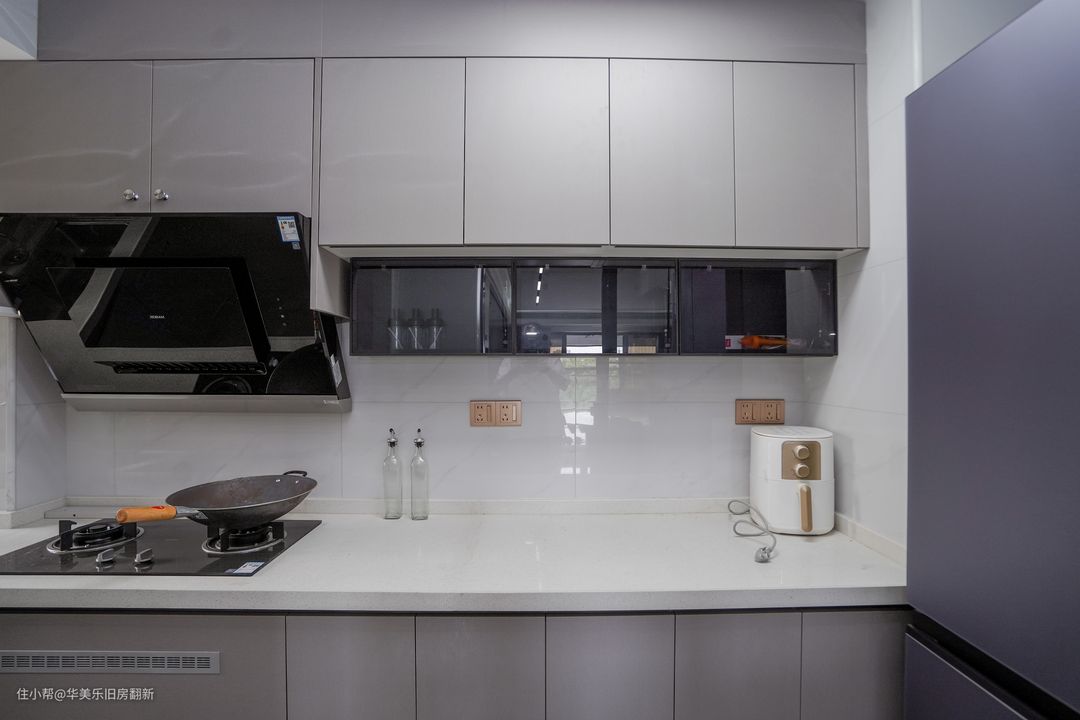 厨房是经典的过道型空间,操作台打造成L型,分出了洗菜、备菜和烹饪三个区域,剩下角落空间放置冰箱。从整体来看内部过道成了操作区,对于操作台每个区域都能轻松驾驭,且区域之间的切换操作也能相当的方便,能实现兼顾全局的效果。