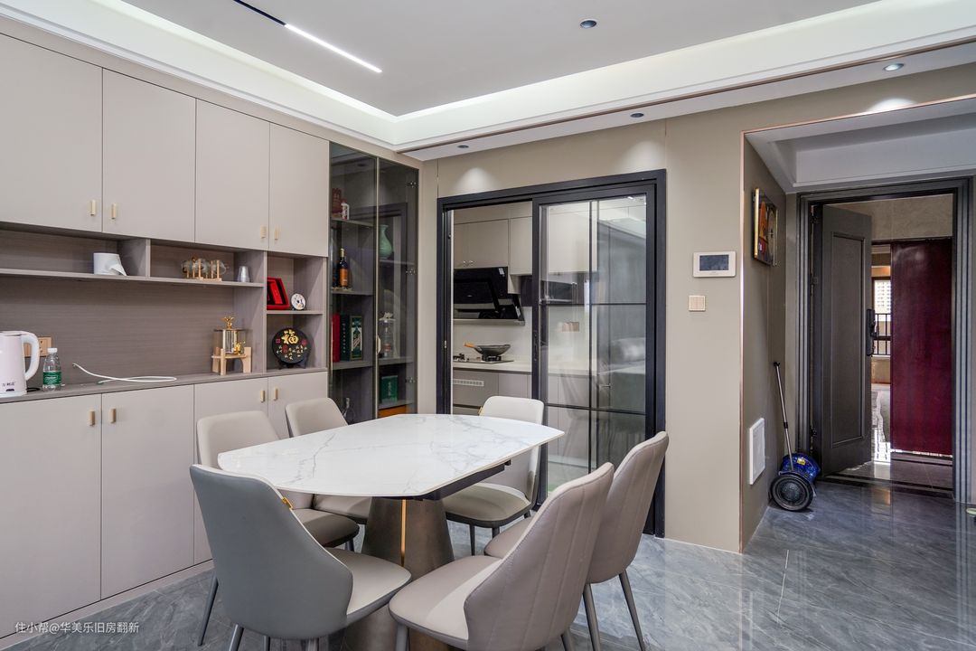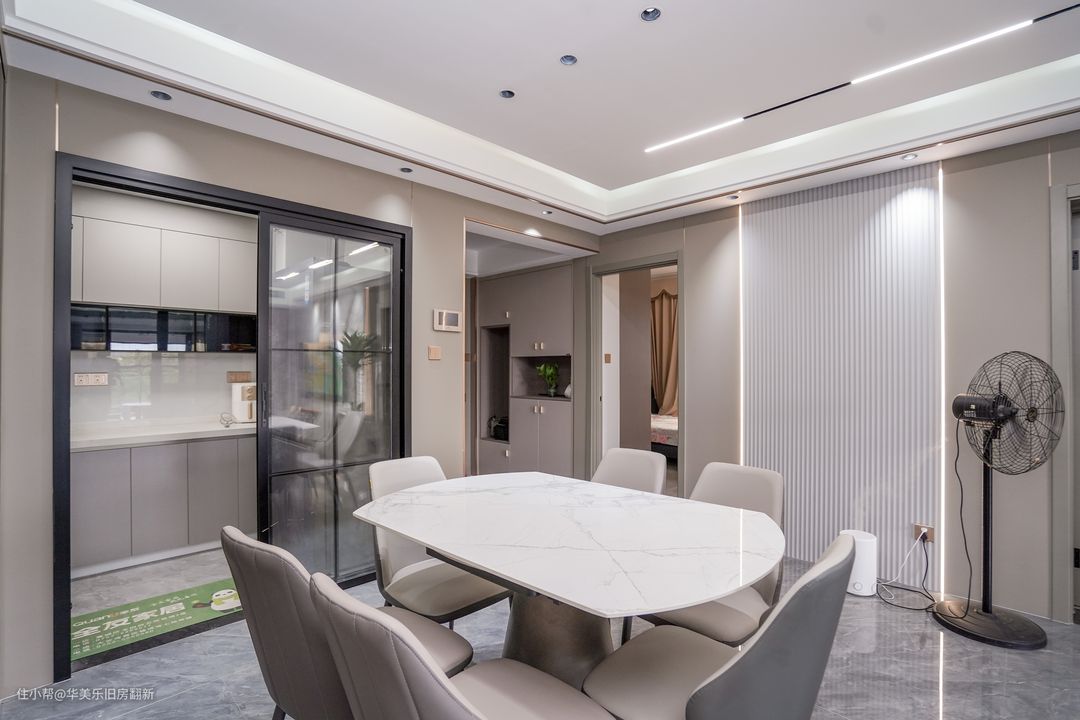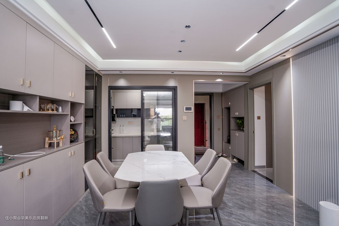 餐厅与客厅构成无隔断的大横厅,天花沿用无主灯设计,让空间的过渡感更自然,两区域之间的交互感也更好。餐桌选用的是岩板餐桌,大小刚好能满足一家子就餐需求,另外桌面下方的还有延展板块,可以拉伸出来拼成大圆桌,即便有多人聚餐的情况也能轻松应对。
