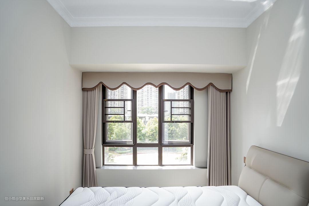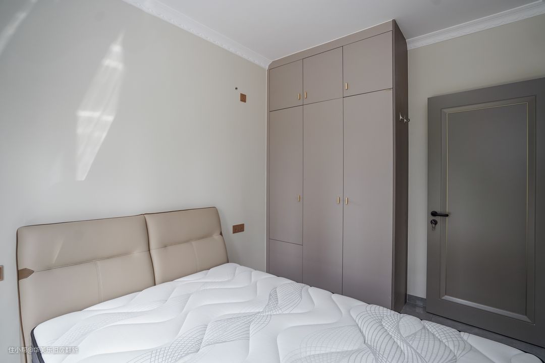 客房相对其他房间要小一些,因此尽量减少不必要的软装来减轻累赘感。另一方面,客房是给偶尔来小住的父母准备的,宽松的房间过道空间也有利于老人家的起居,减少磕碰的可能。
