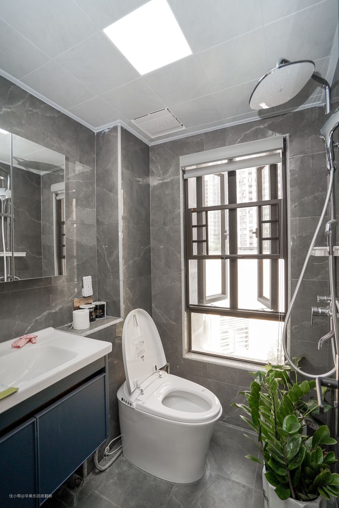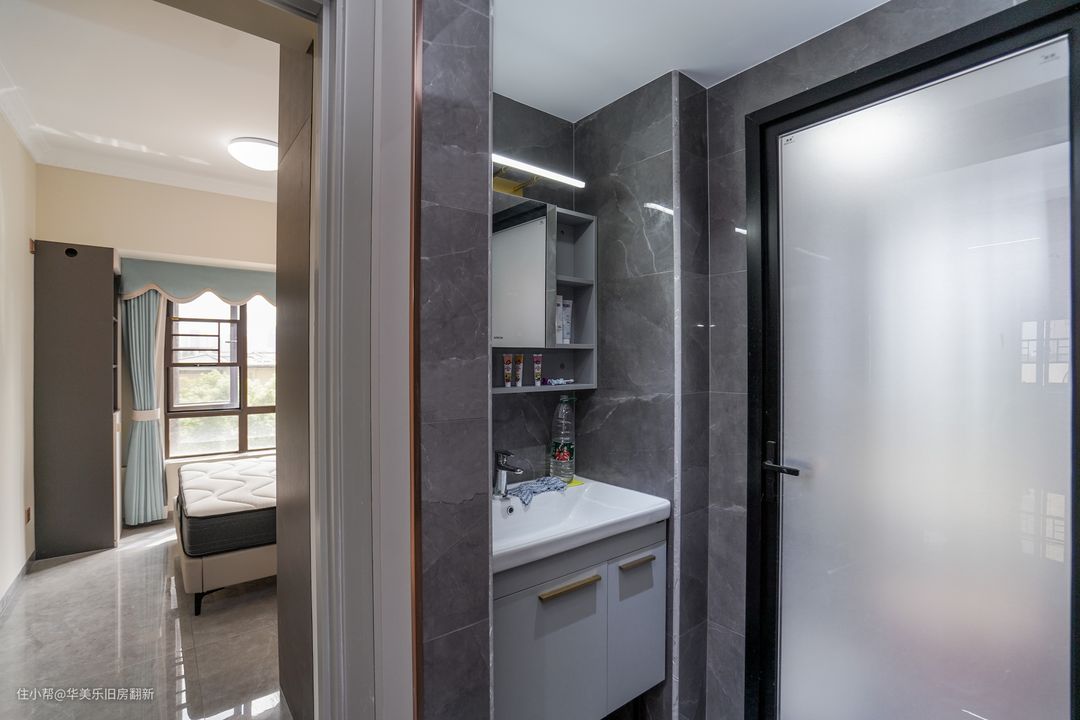 卫生间实现了干湿三分离,作为独立区域的洗漱区能更方便家庭成员按需对卫生间不同区域进行选择性使用,提高使用效率。镜柜的设计有意将镜子柜缩小,周边改为开放式的格子,方便常用工具的摆放和拿取。
