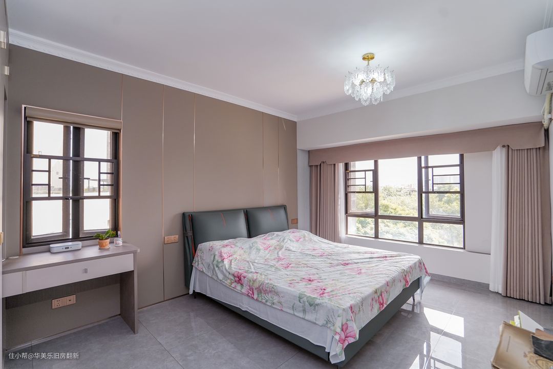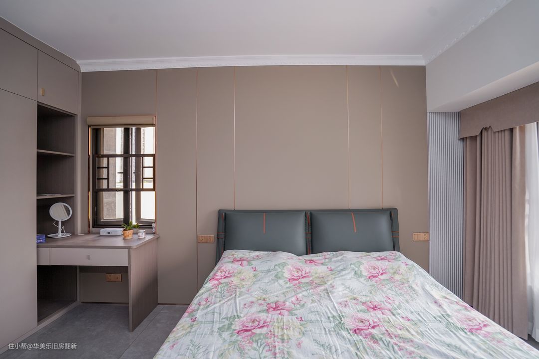 主卧以浅咖和灰白三色作为空间主色,沉稳中不失温馨感。房间不打造飘窗让床榻两旁能安放床头柜,也让两边的能拥有宽松的过道空间。床榻后方背景墙安装了装饰板,整体的搭配让主卧产生良好的空间感和舒适感。