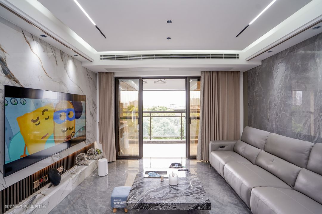 客厅通铺浅灰云纹地板让客厅呈现明亮感,并且搭配茶色的阳台门玻璃也不容易让室内产生反光。天花采用的无主灯设计,灯饰方面选择了时下流行的磁吸轨道灯和无主射灯的组合,室内光源调节更有灵动性。