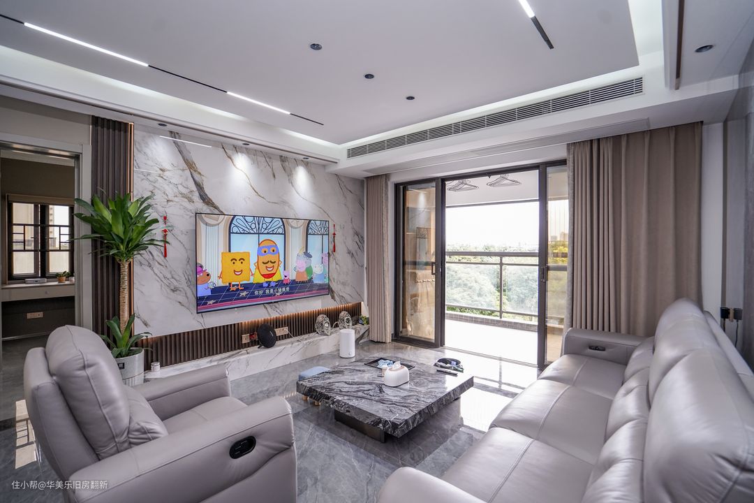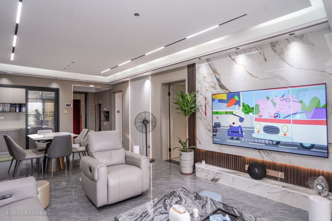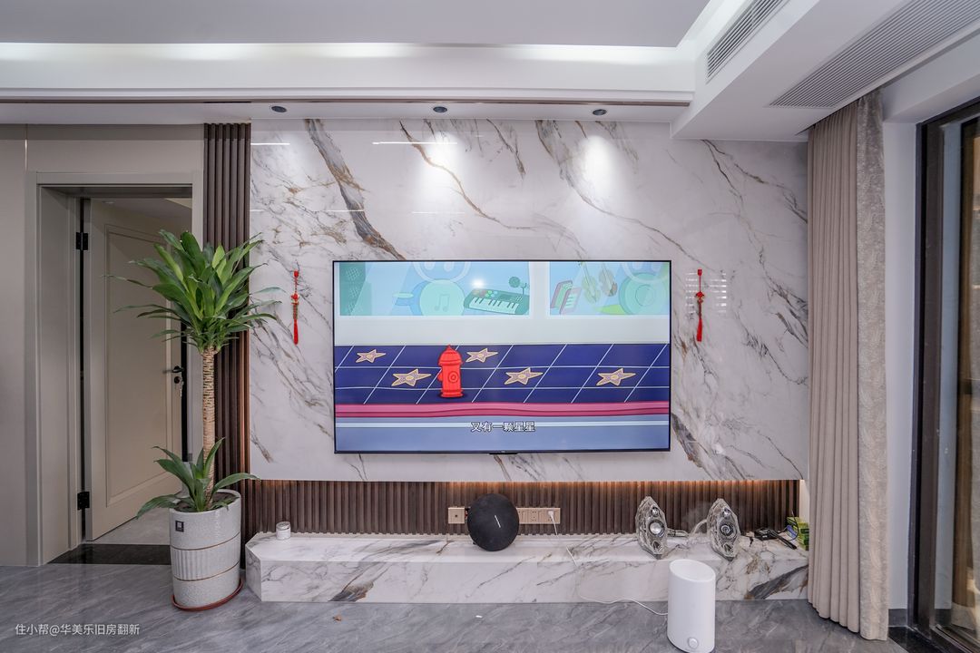 电视背景墙以木饰面为底板,表层加装一层与地板相呼应的装饰板,凸显客厅的高端大气形象。电视的线路提前做了预埋处理,让整个背景墙看球来更加的干净,下方没有打造电视柜而改为简约底台,让外观形象看起来更自然。客厅设置的岩板茶几也十分有特地,加厚的岩板和大面积的设定让客厅的视觉效果更加的高级且富有质感。