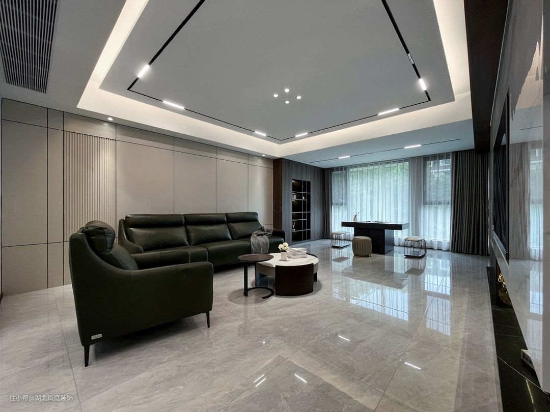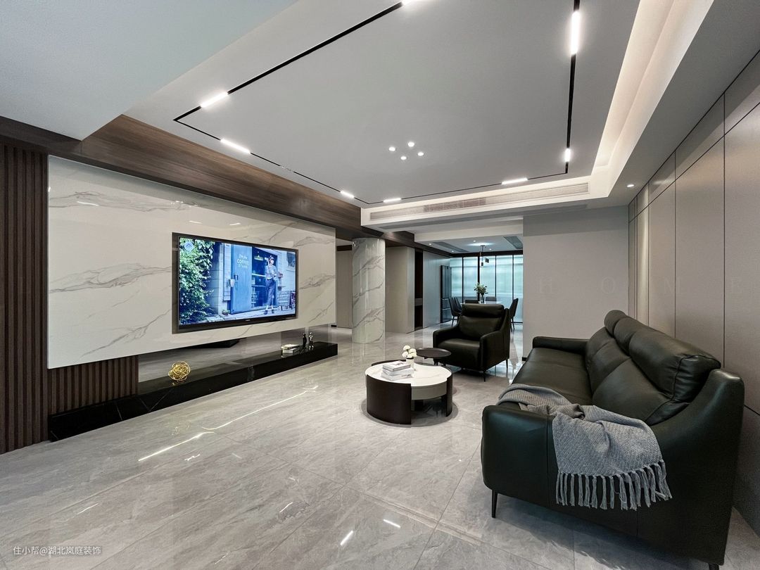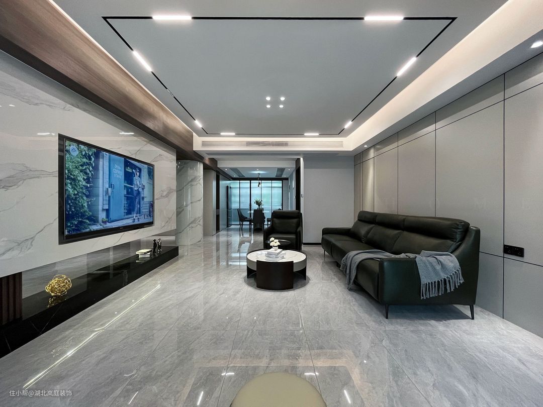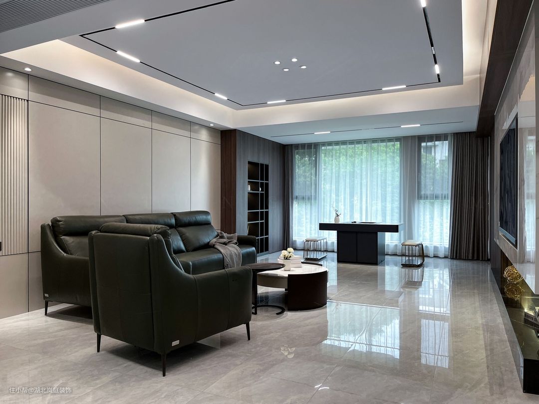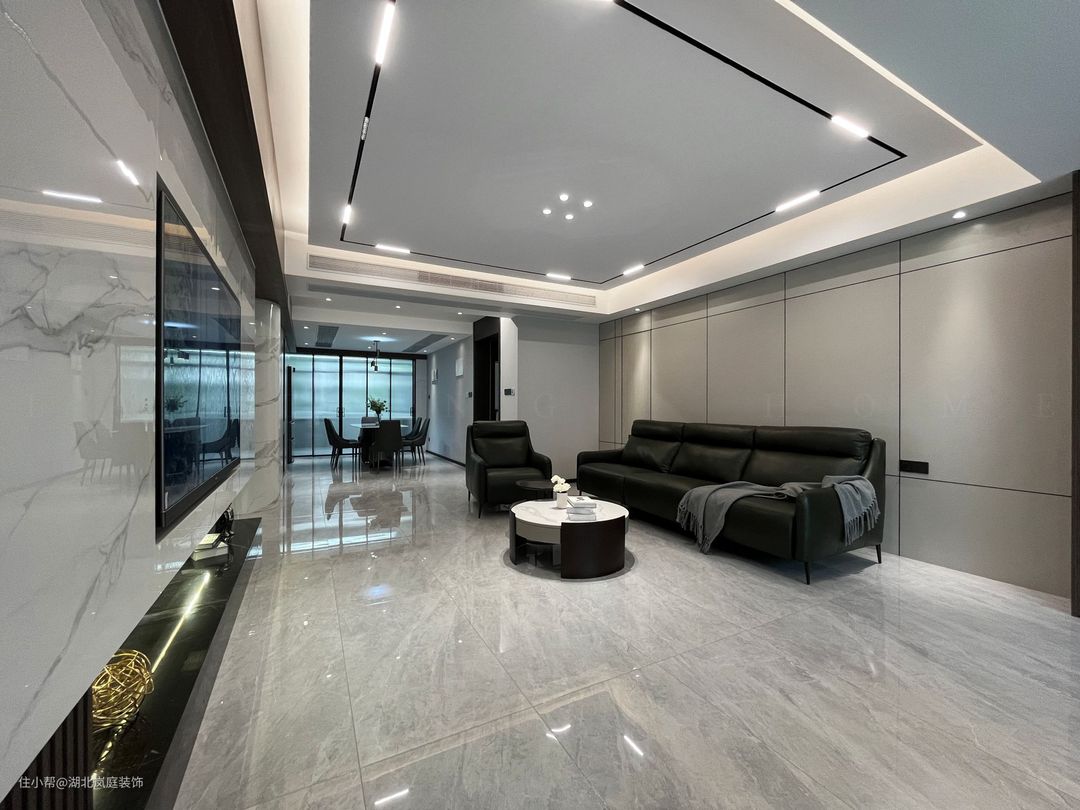 黑白灰给客厅整体氛围定下基调,极简风格,精致造型;简单,但细看又有乾坤。 无主灯设计,高级有秩序;弱化横梁,没有奢侈材质装饰的背景墙,也独有自己的造型与设计感。 在灰色基调中客厅功能于视线中敞开,超大落地窗,格外适宜承载综合的客厅功能。面积足够,通透明亮,这些组合起来的每一点都显得尤为重要。 大落地窗让自然光均匀的洒落在空间之内,黑色沙发,搭配几何造型茶几,让空间弥漫出一种轻松与舒适之感。