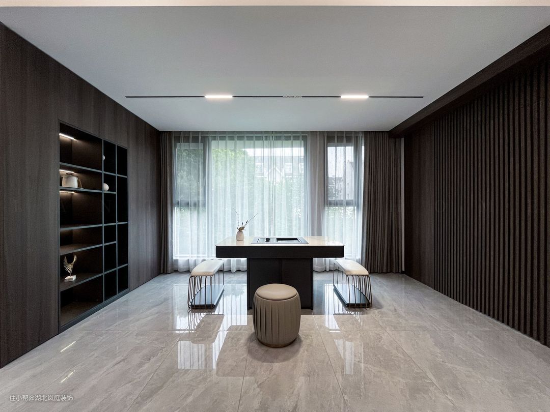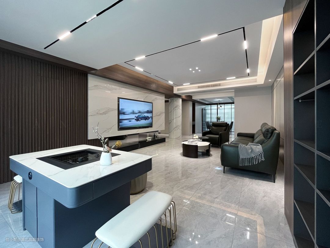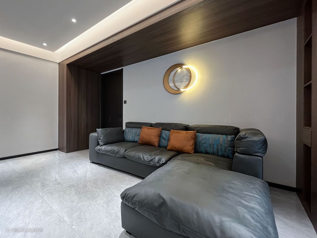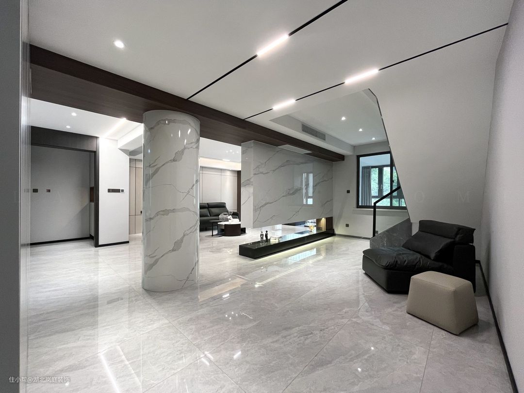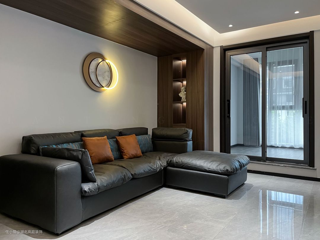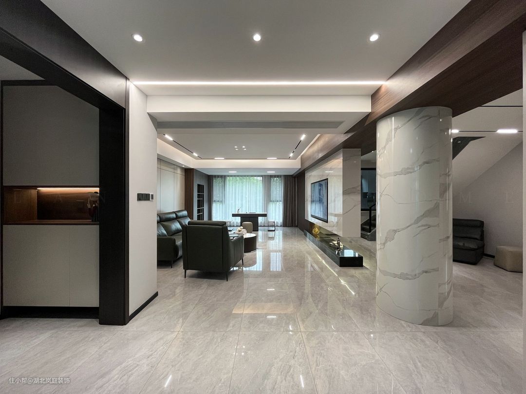 黑白灰给客厅整体氛围定下基调,极简风格,精致造型;简单,但细看又有乾坤。 无主灯设计,高级有秩序;弱化横梁,没有奢侈材质装饰的背景墙,也独有自己的造型与设计感。 在灰色基调中客厅功能于视线中敞开,超大落地窗,格外适宜承载综合的客厅功能。面积足够,通透明亮,这些组合起来的每一点都显得尤为重要。 大落地窗让自然光均匀的洒落在空间之内,黑色沙发,搭配几何造型茶几,让空间弥漫出一种轻松与舒适之感。