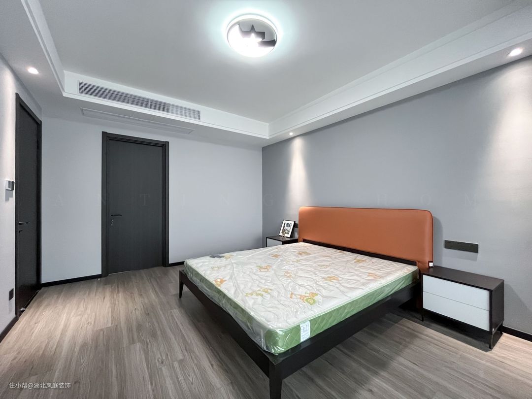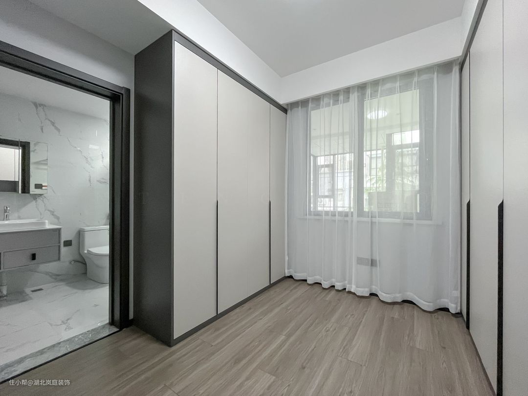 步入次卧空间,纹理细腻的原木地板搭配大面积落地窗,珍珠白幻影纱赋予居住空间更深层次的柔美与质感,烘托温馨优雅的卧室氛围。 米色软包床头搭配浅灰色床品,没有做过多其他装饰,不刻意追求视觉上的新奇,以自然简单为居住理念。 进门处同样打造衣帽间,有效利用空间。纯白简约柜门面板呼应空间,打造静谧享受地。