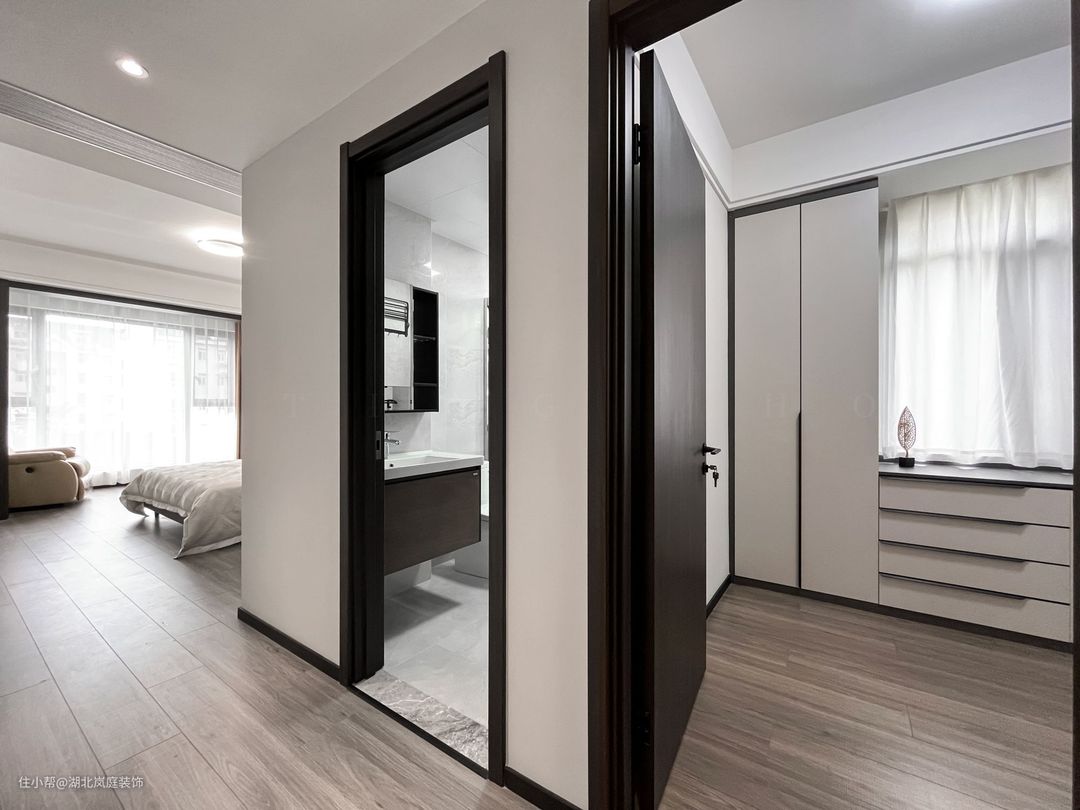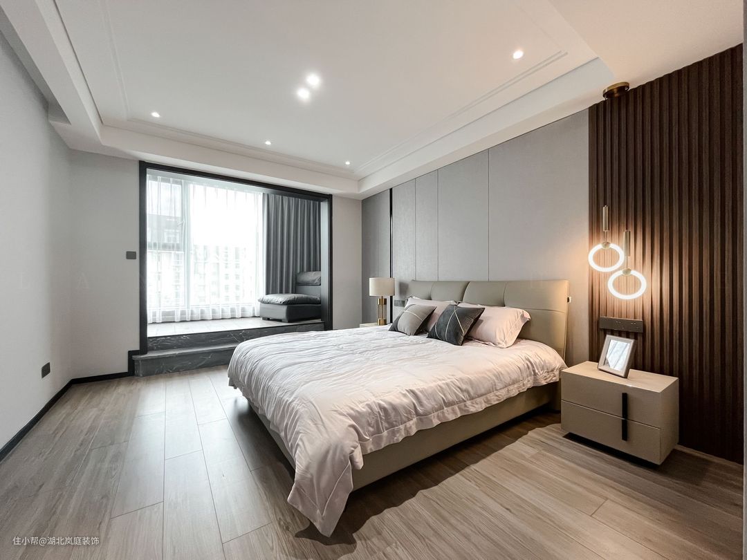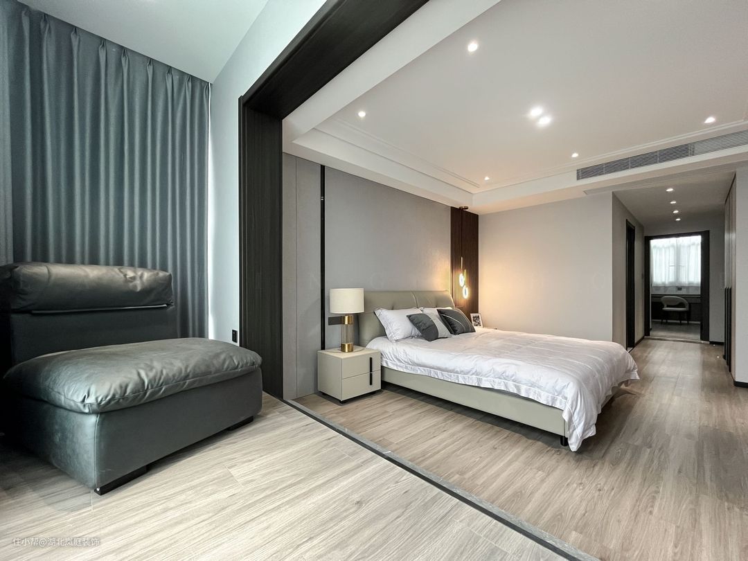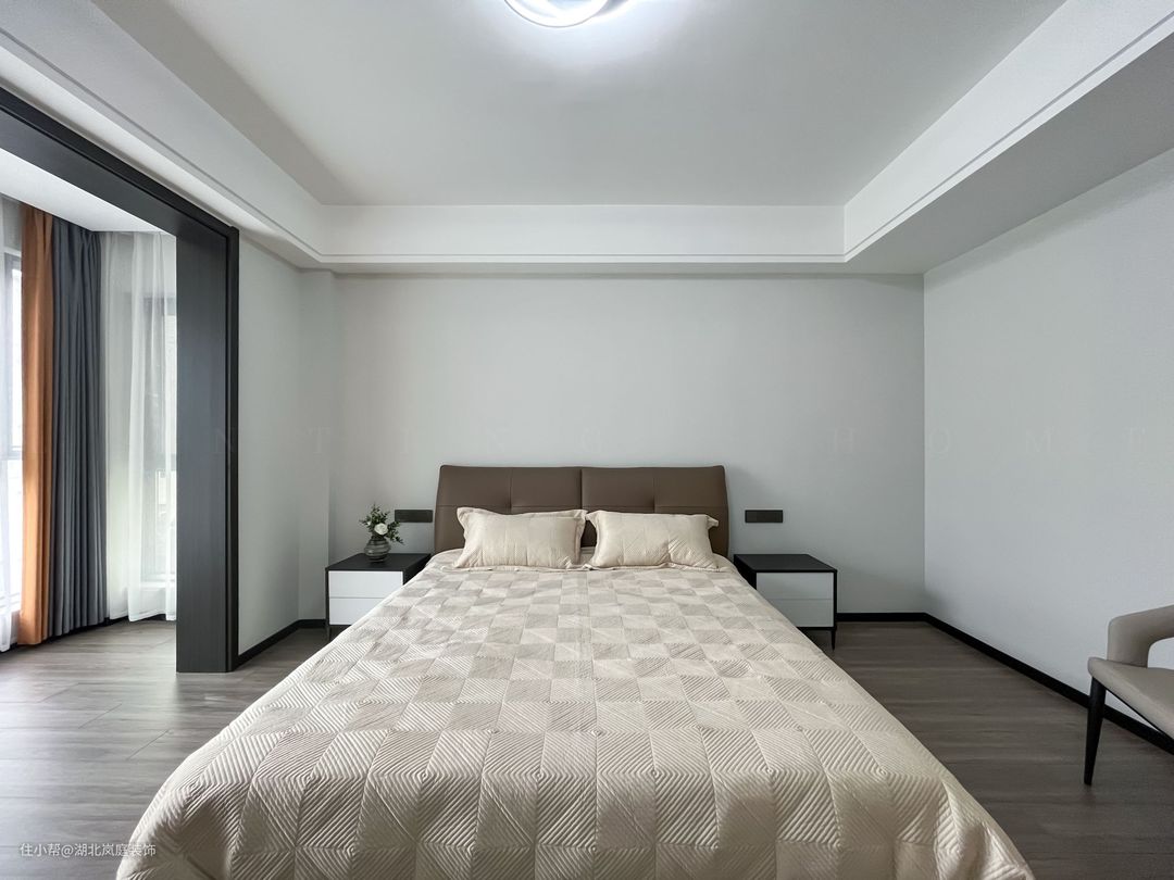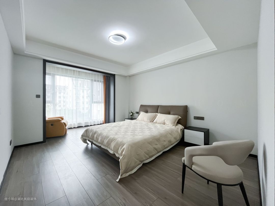 主卧整体采用奶咖色调,室内色彩和谐统一,氛围舒适自然。床头原木栅格+护墙板设计,搭配精致的床头灯点缀,无主灯柔和不刺眼,保证室内采光,简单大气的设计更显质感。 进门处是单独的衣帽间,通顶衣柜,纯白+黑色把手的设计,提升室内收纳空间。灰色简约床头柜,抽屉式拉取,更方便摆放常用小物件。 阳台做地台加高设计自然划分阳台休闲区,整体以黑白灰为基调,无过多繁杂的装饰,简单而纯粹。超大落地窗搭配灰色系的窗帘,一张舒适的沙发椅,阳光倾洒进室内,营造出慵懒肆意的卧室环境。
