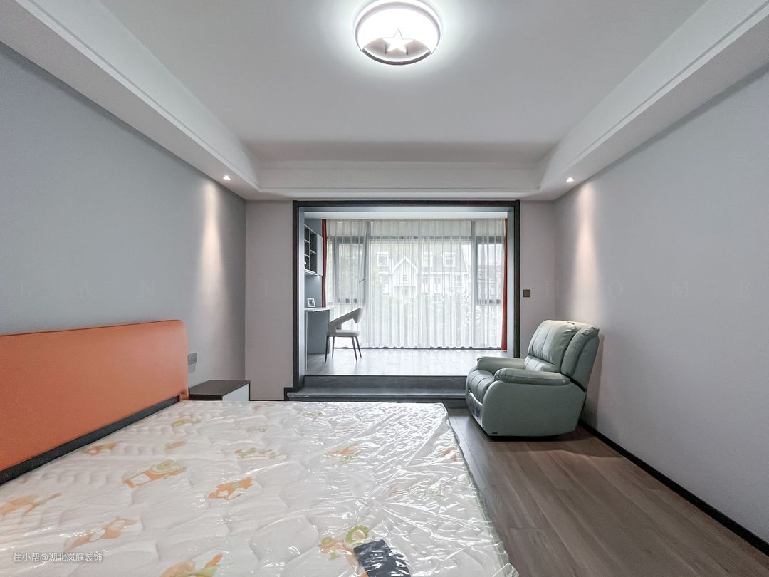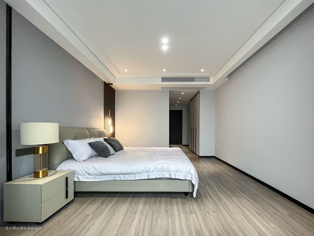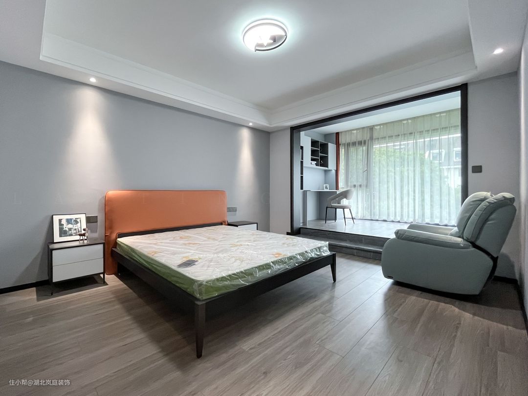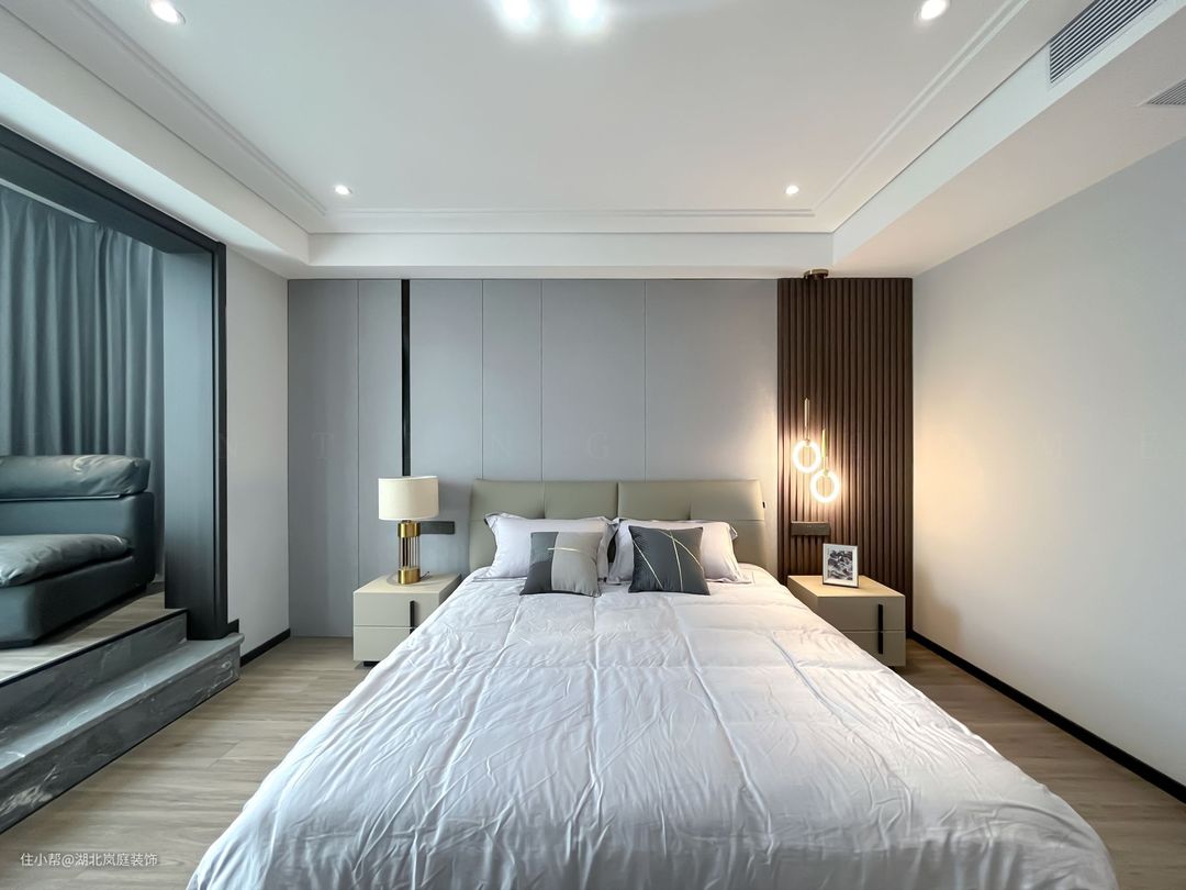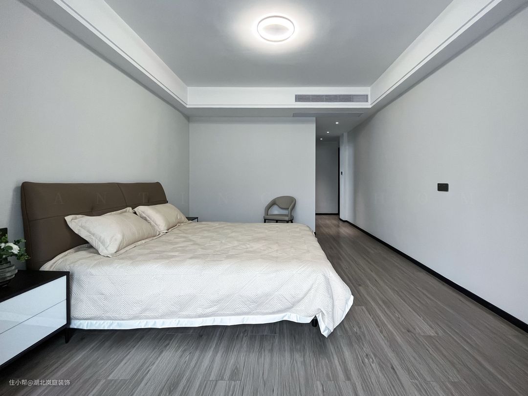 主卧整体采用奶咖色调,室内色彩和谐统一,氛围舒适自然。床头原木栅格+护墙板设计,搭配精致的床头灯点缀,无主灯柔和不刺眼,保证室内采光,简单大气的设计更显质感。 进门处是单独的衣帽间,通顶衣柜,纯白+黑色把手的设计,提升室内收纳空间。灰色简约床头柜,抽屉式拉取,更方便摆放常用小物件。 阳台做地台加高设计自然划分阳台休闲区,整体以黑白灰为基调,无过多繁杂的装饰,简单而纯粹。超大落地窗搭配灰色系的窗帘,一张舒适的沙发椅,阳光倾洒进室内,营造出慵懒肆意的卧室环境。