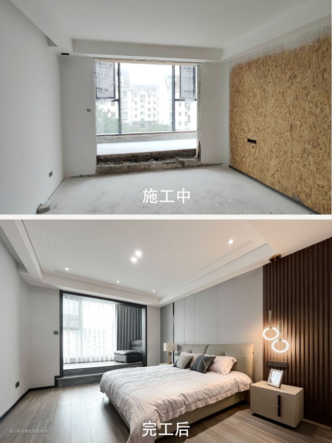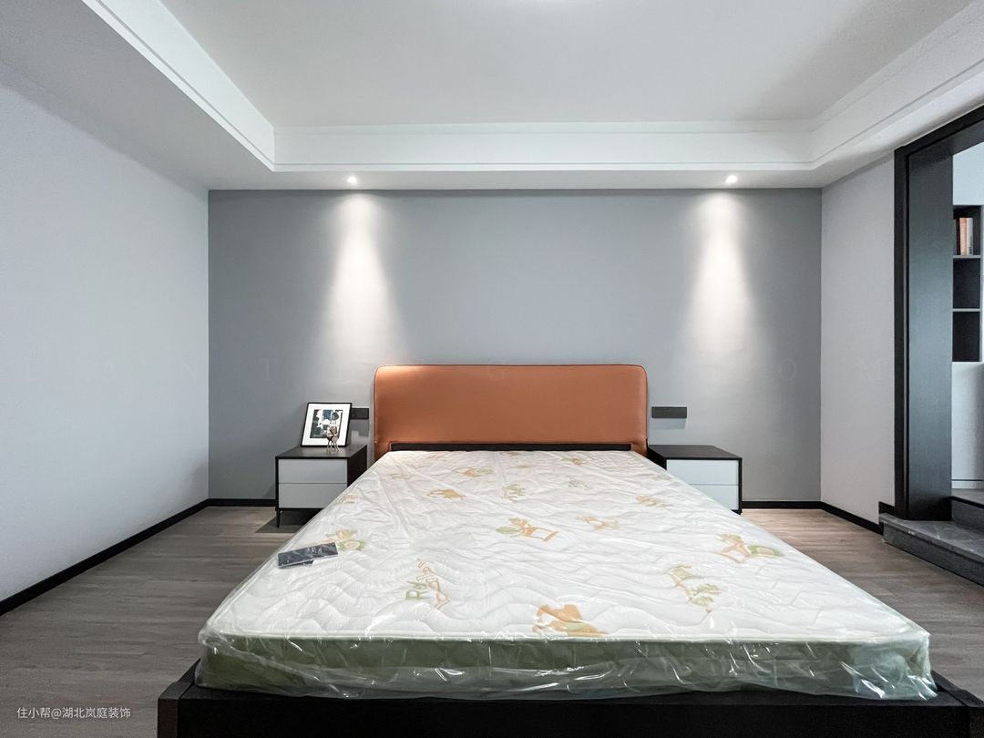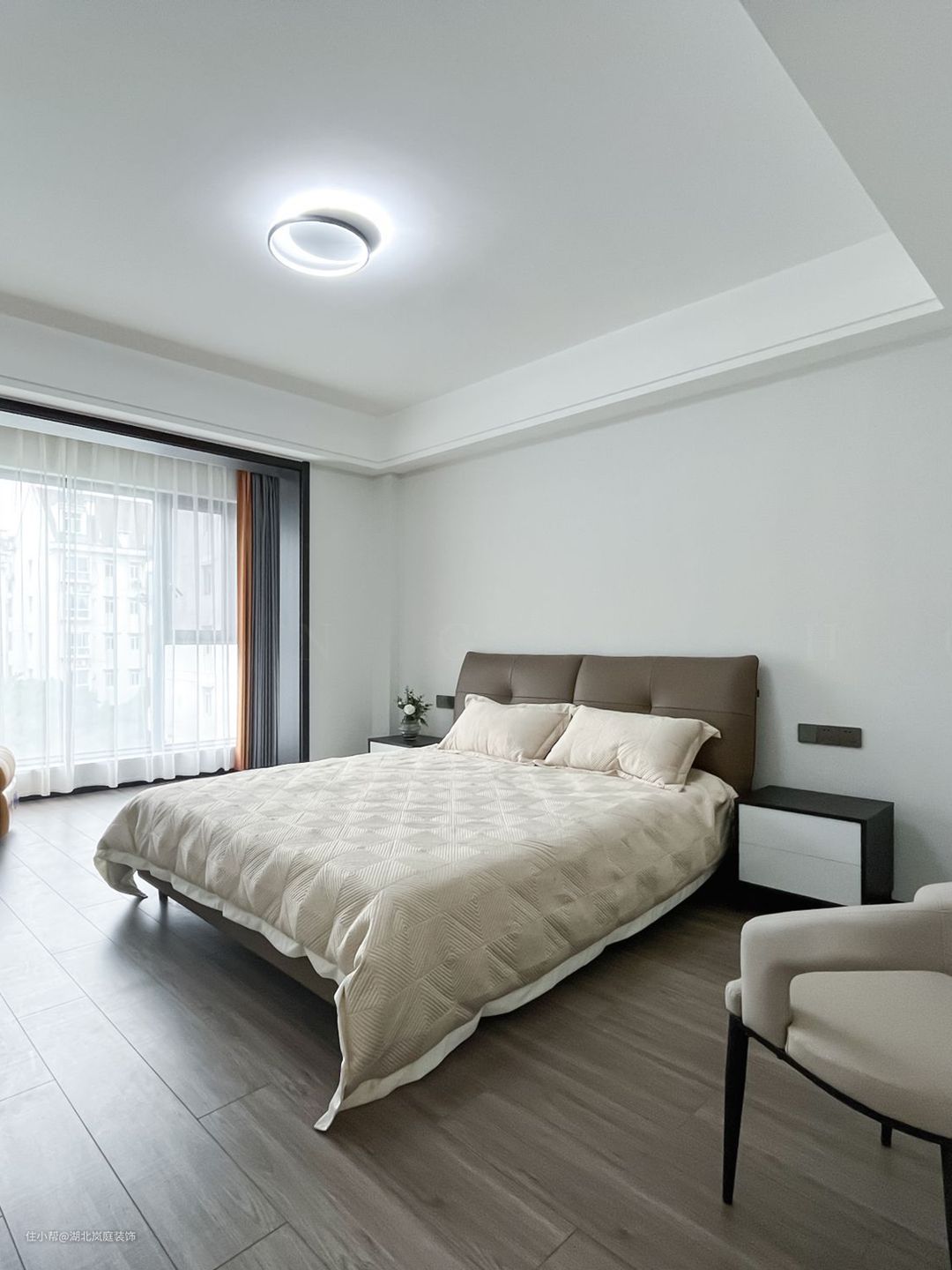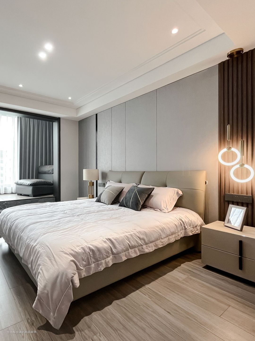 主卧整体采用奶咖色调,室内色彩和谐统一,氛围舒适自然。床头原木栅格+护墙板设计,搭配精致的床头灯点缀,无主灯柔和不刺眼,保证室内采光,简单大气的设计更显质感。 进门处是单独的衣帽间,通顶衣柜,纯白+黑色把手的设计,提升室内收纳空间。灰色简约床头柜,抽屉式拉取,更方便摆放常用小物件。 阳台做地台加高设计自然划分阳台休闲区,整体以黑白灰为基调,无过多繁杂的装饰,简单而纯粹。超大落地窗搭配灰色系的窗帘,一张舒适的沙发椅,阳光倾洒进室内,营造出慵懒肆意的卧室环境。