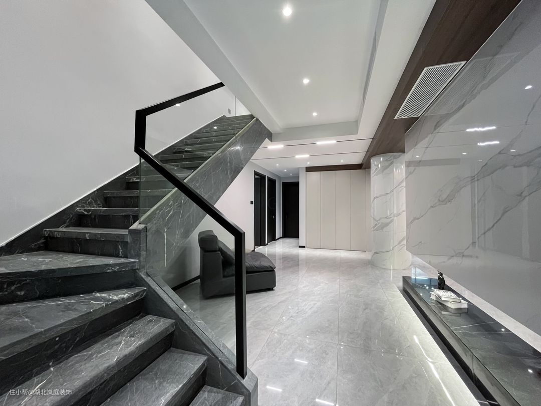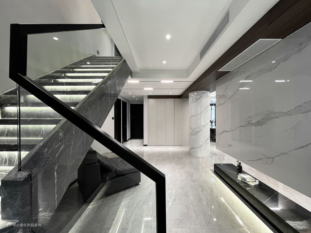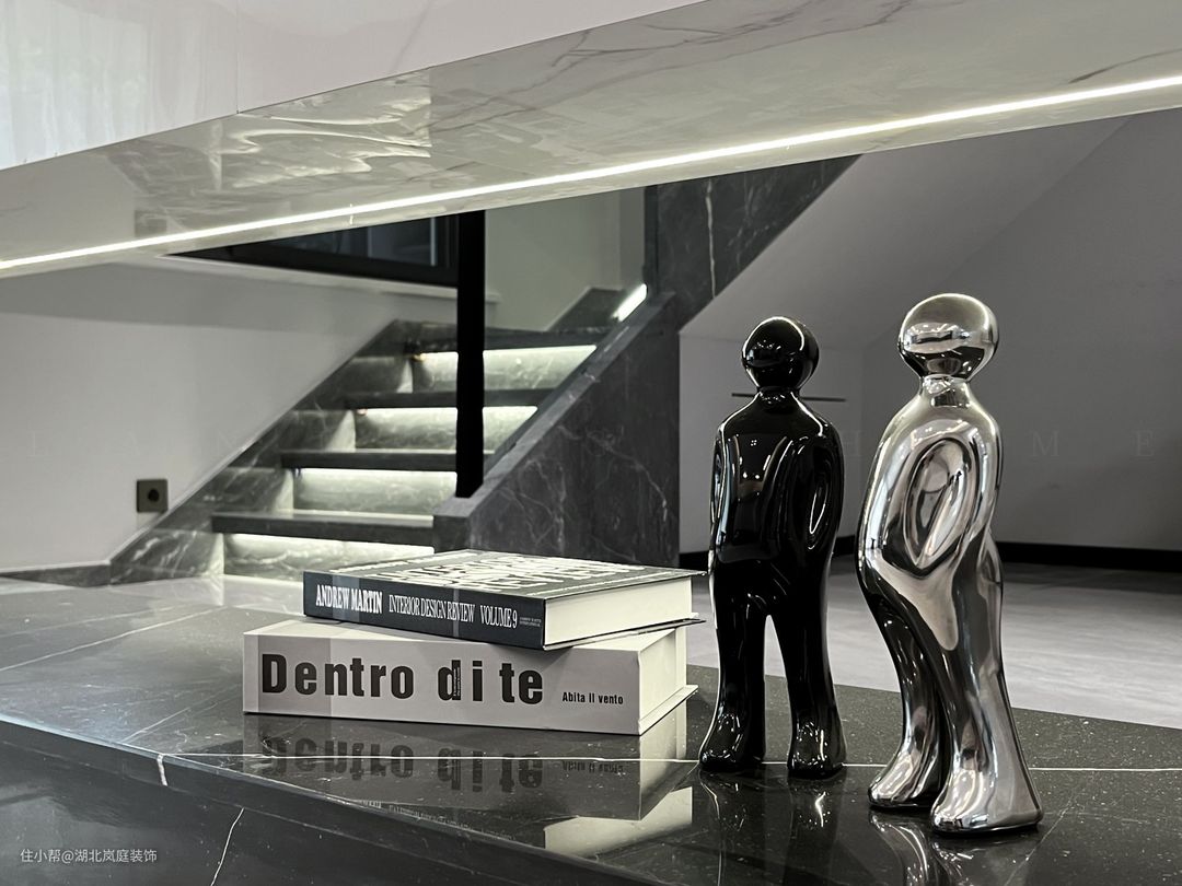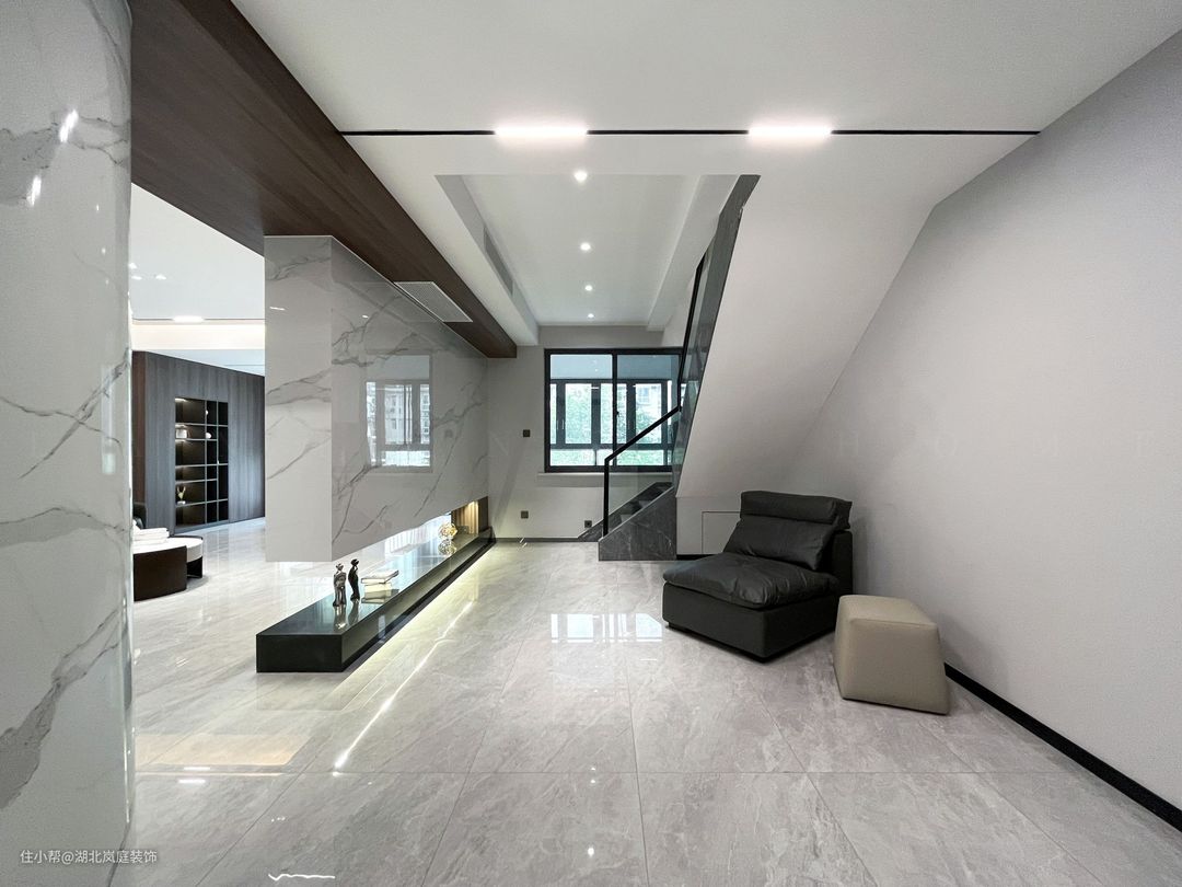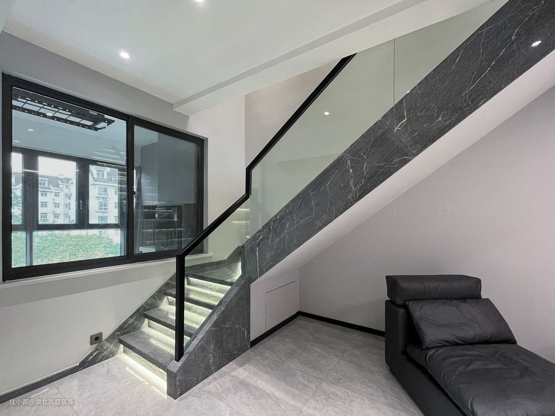 在多层空间中建构生活方式可以更舒展的发散,功能类型清晰的聚集执行,根据家庭规模匹配出空间层级,独立与秩序随层次确立妥善。 在这所叠墅空间开始一家的新生活,业主一家性格爽朗干脆,钟爱干净简单的生活方式,不是往大房子堆积奢侈的精致感,而空间中秩序建立和生活的限度。结构的洁净是空间质地,色彩上黑白灰的调性也促成空间利落的气质,在喧嚣中,设计师为他们布置出简明、洁净、有序的家宅。