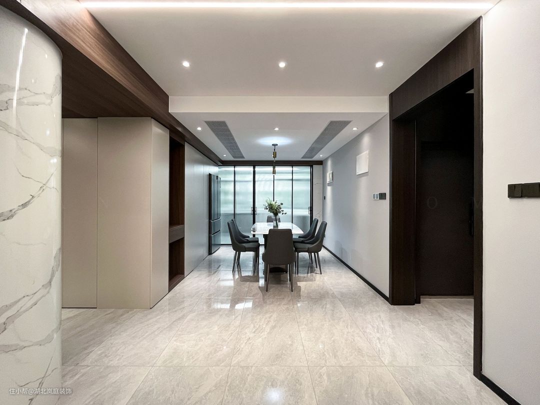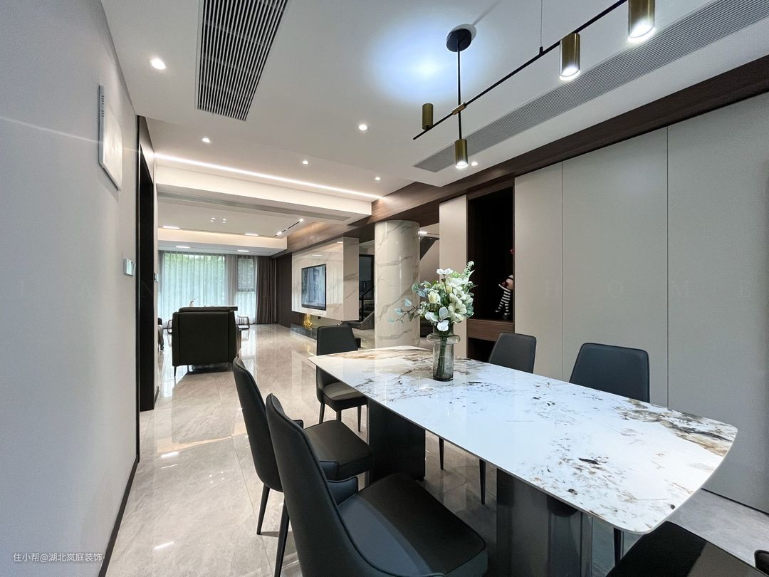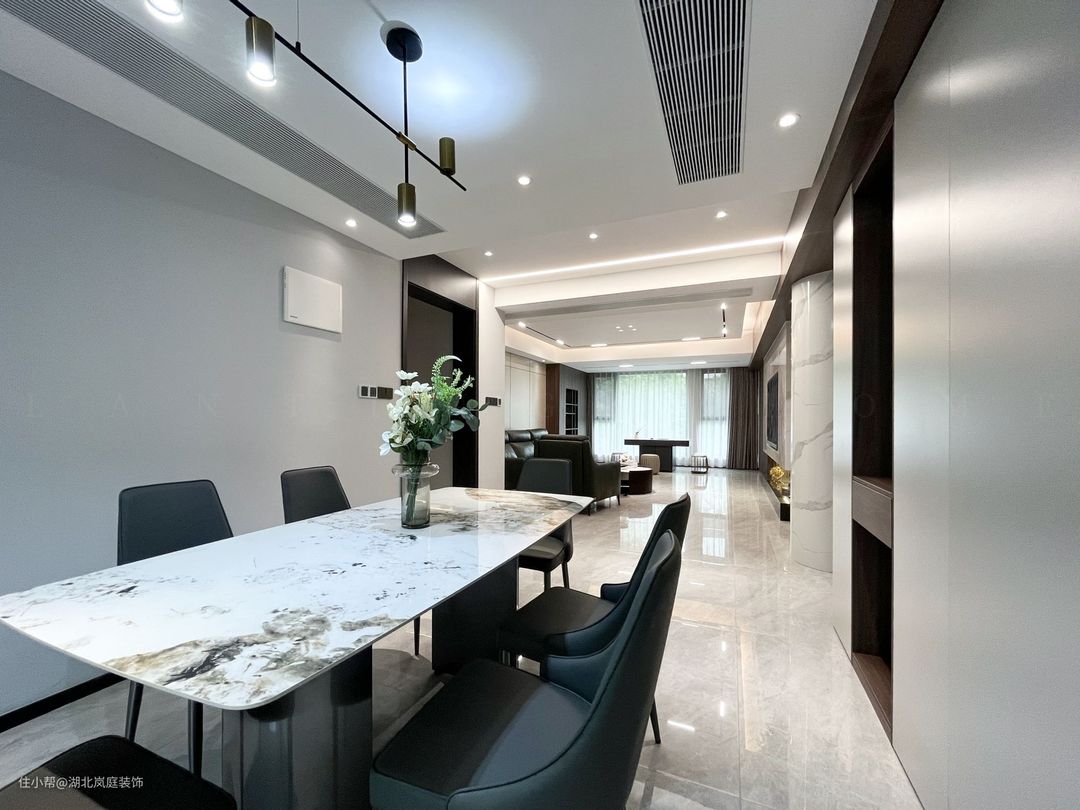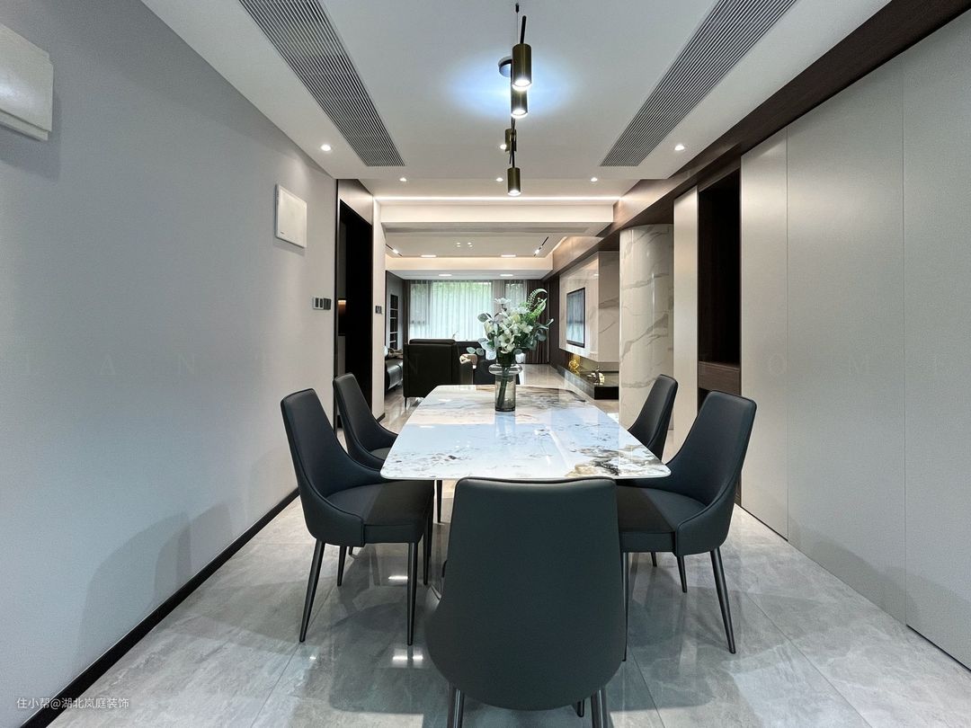 开放式客餐厅设计利于家人之间的互动。大理石纹岩板餐桌,时尚大方,配以黑色皮质餐椅,与整个餐厅融合出高级质感。上方艺术吊灯加以装饰,整个空间充满了轻奢氛围。 餐厅一侧设计内嵌式柜体,加上嵌入式冰箱,收纳力更强,内部格局多样化。中部设计开放式的储物格,视觉上更显轻盈,富有格调。