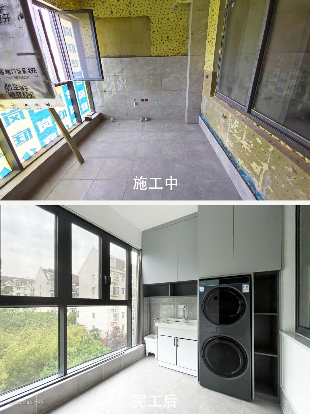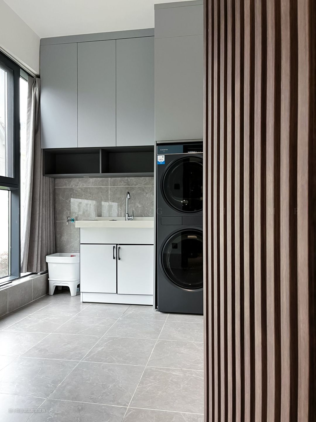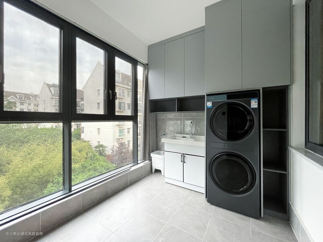 阳台一半与客厅连接,设计成茶室,摆上一套茶具及桌椅,墙面设计成收纳立柜,茶具和茶叶能妥当安置,不显凌乱。一处阳台,一间茶室,煮一壶好茶,品味人生。 另一部分阳台改成洗衣房,洗衣晾衣一步到位。将阳台一面墙打造成嵌入式洗衣柜+吊柜+水盆的组合,把洗衣、洗拖把、收纳清洁用品三个功能通过一个柜子实现。
