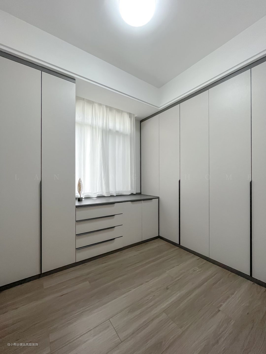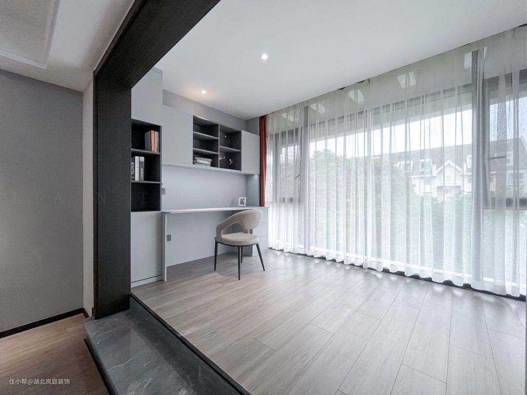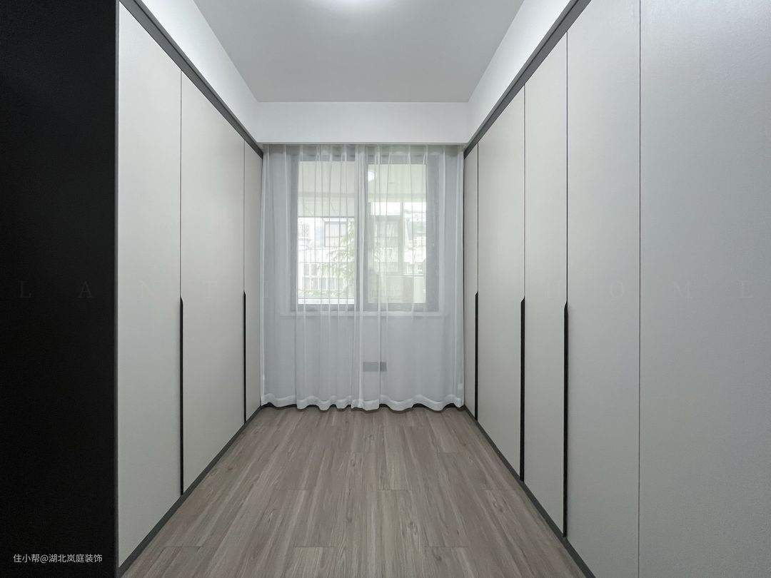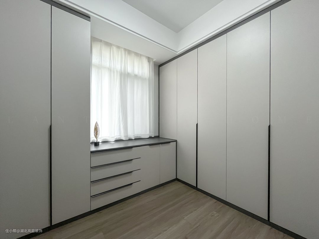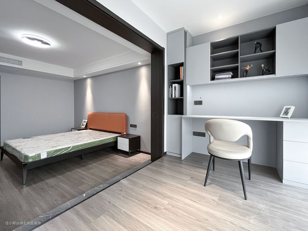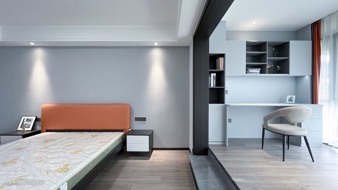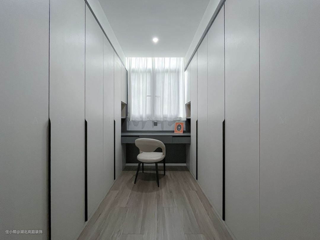 次卧通体全白的色调落落大方,作为儿童房使用,简洁白的墙面基础,布置上橙色皮质床,为空间增添一抹活力。 阳台同样做地台加高设计,保证空间通透,又自然分隔出两个的空间区域。靠墙打造一体式书桌+书柜组合,方便学习办公使用。落地窗照入的光线宁静雅致,整体视觉给人清爽通透之感。 同样设置了单独的衣帽间,通顶衣柜,纯白+黑色把手的设计,提升室内收纳空间。