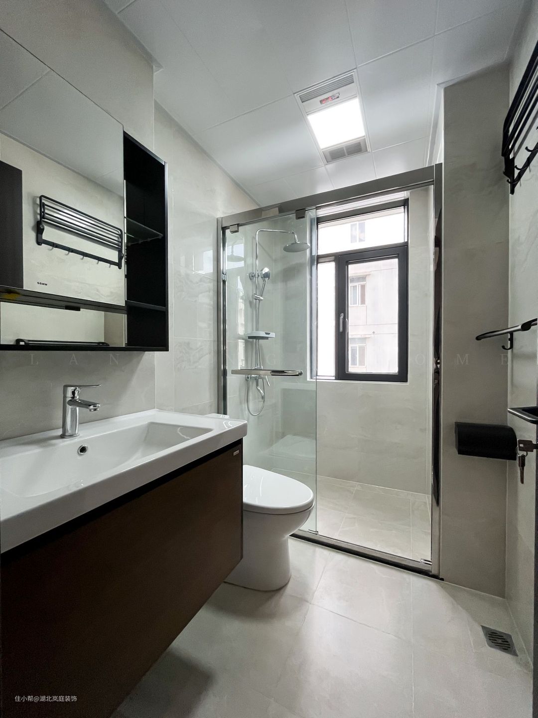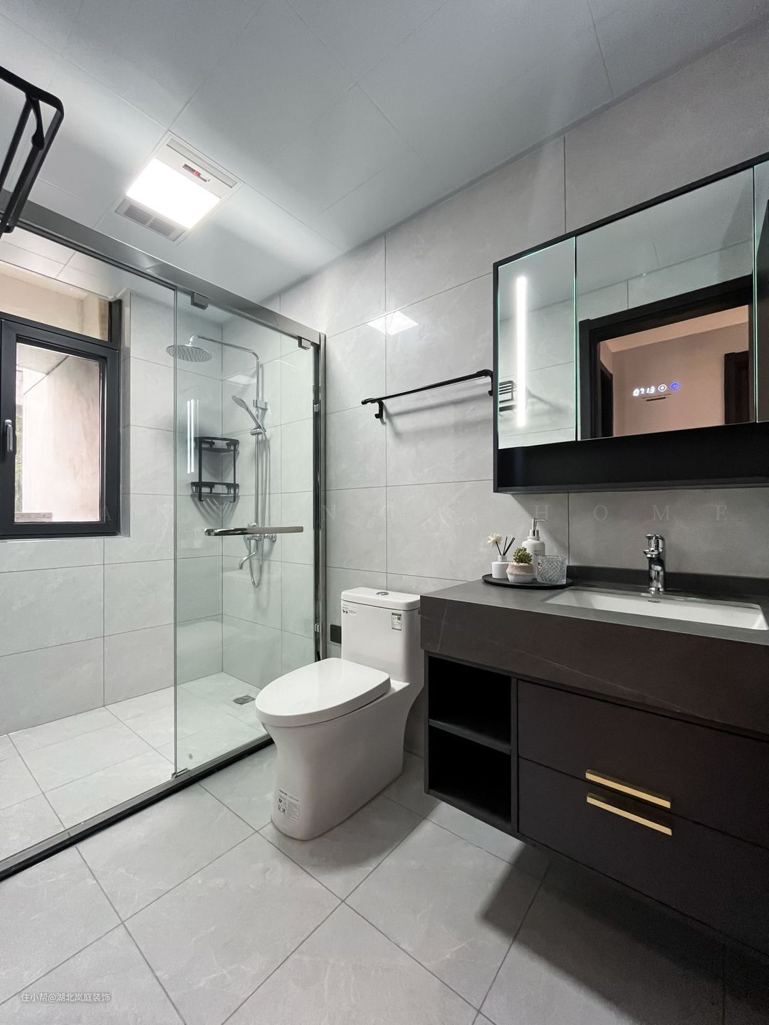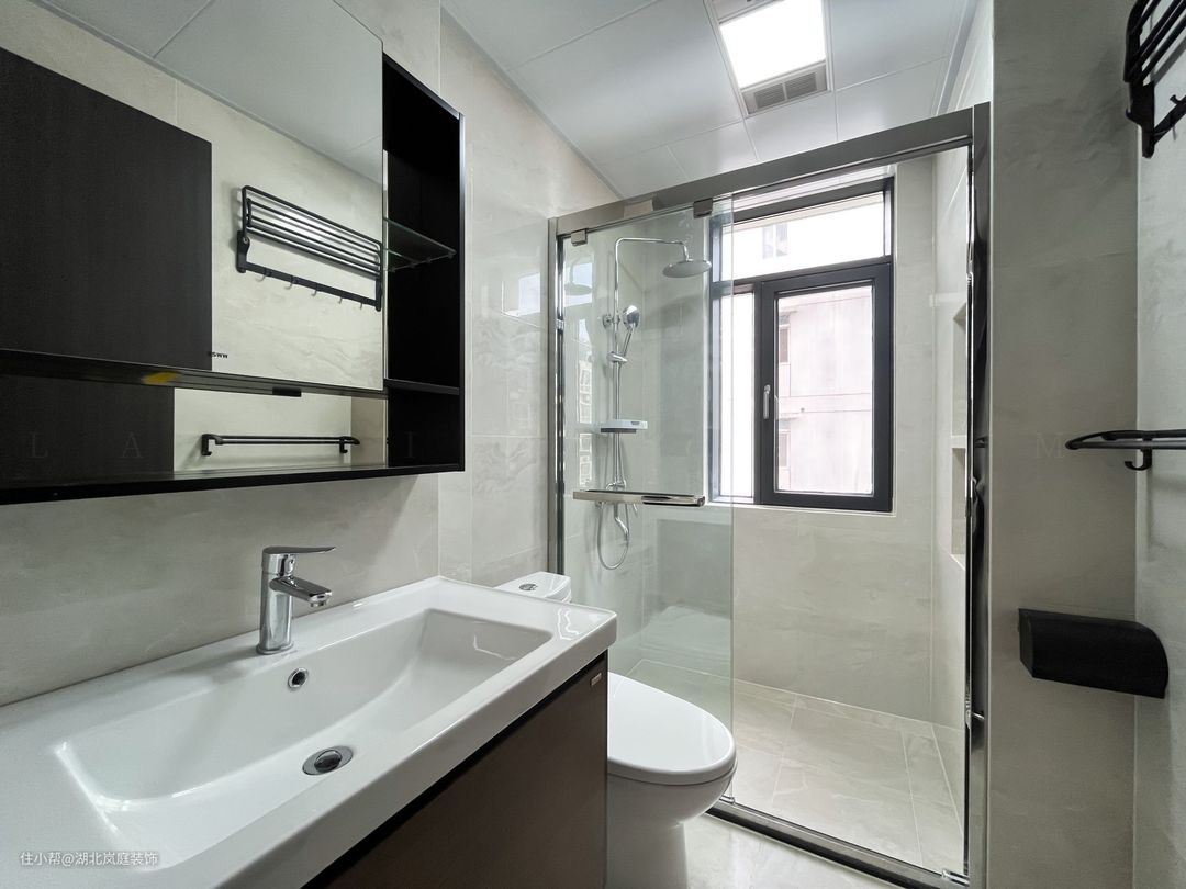 卫生间整体以白色为基调,简约具有质感。悬空浴室柜方便清扫,镜柜的设计,增加置物空间,透明玻璃门很好的从视觉上消除了干湿分离空间带来的压抑感,也不会阻挡室外光线的照射,普通生活里也能熠熠生辉的浪漫。