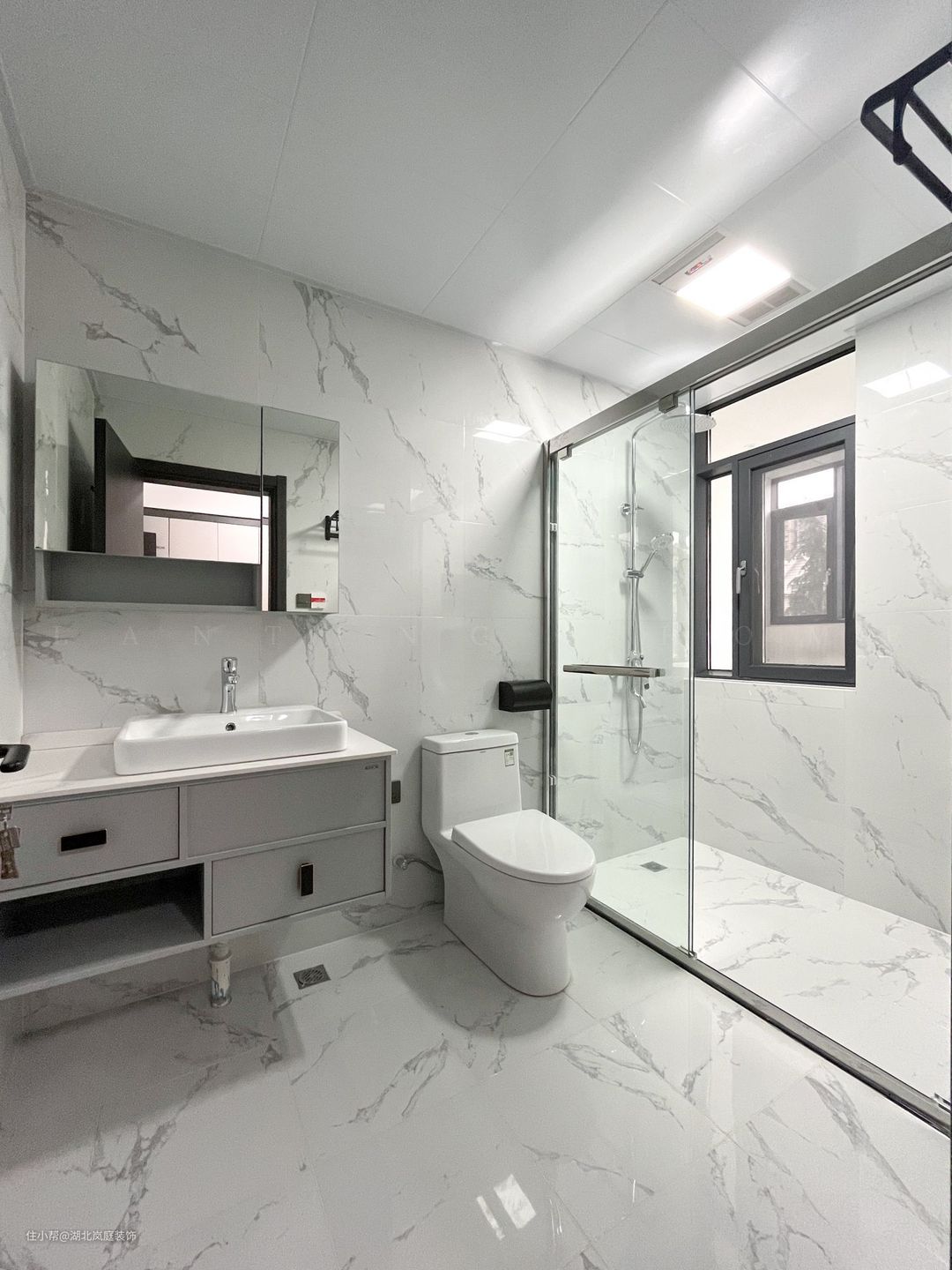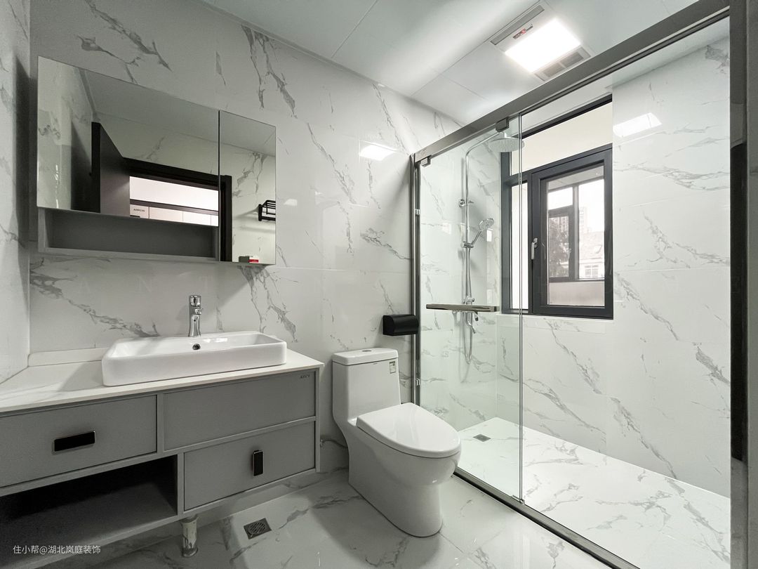 卫生间整体以白色大理石砖通铺,简约具有质感。悬空浴室柜方便清扫,镜柜的设计,增加置物空间,透明玻璃门很好的从视觉上消除了干湿分离空间带来的压抑感,也不会阻挡室外光线的照射,普通生活里也能熠熠生辉的浪漫。
