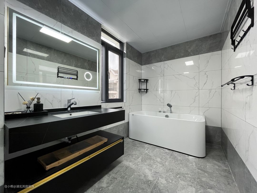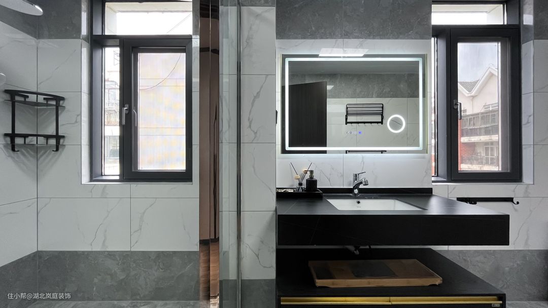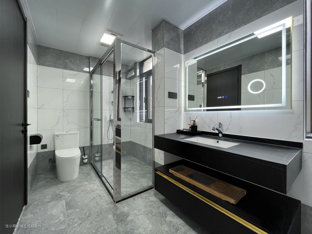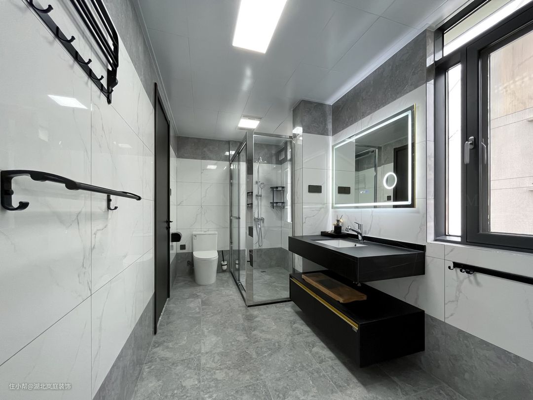 公共区域卫生间整体以白色为基调,简约具有质感。黑色的悬空浴室柜方便清扫,镜柜的设计,增加置物空间,透明玻璃门很好的从视觉上消除了干湿分离空间带来的压抑感,也不会阻挡室外光线的照射。