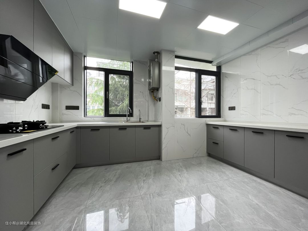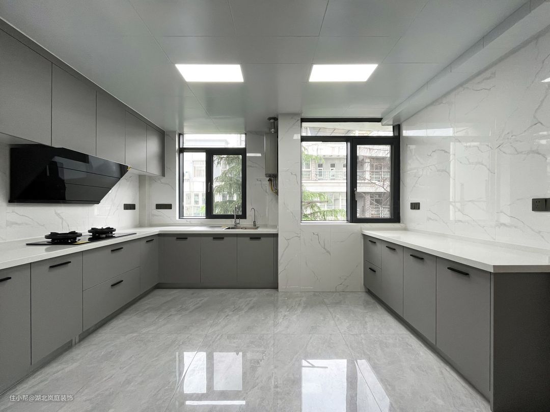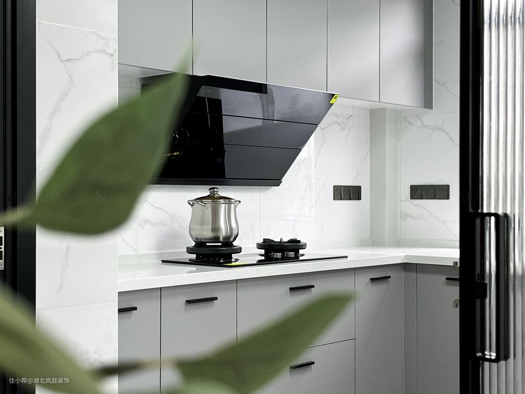厨房空间丰裕,浅灰色柜体搭配白色的台面。高柜做到顶设计+嵌入式厨电,收纳空间充足的同时保证空间视觉平整度。 在足够的操作与收纳两种功能之外增添了一个小操作台的功能区,厨房不再是会做饭的人的专属,陪伴与互动的场景成为它的新标签。