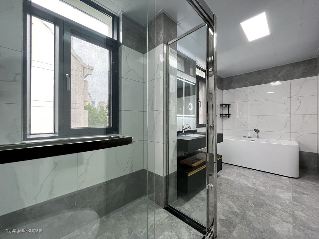 主卧卫生间空间宽敞,淋浴区采用玻璃门作干湿分离,另一边布置浴缸享受惬意泡澡时光