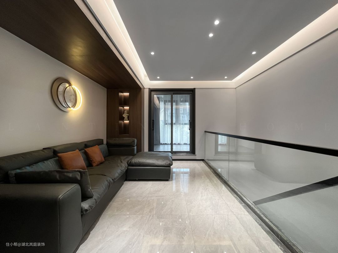 二楼的开放空间加入舒适的沙发,白色+原木的背景,点缀暖色系灯光。阳台落地窗采用玻璃移门作为空间分隔,让自然光均匀的洒落在空间之内,弥漫出一种轻松与舒适之感。