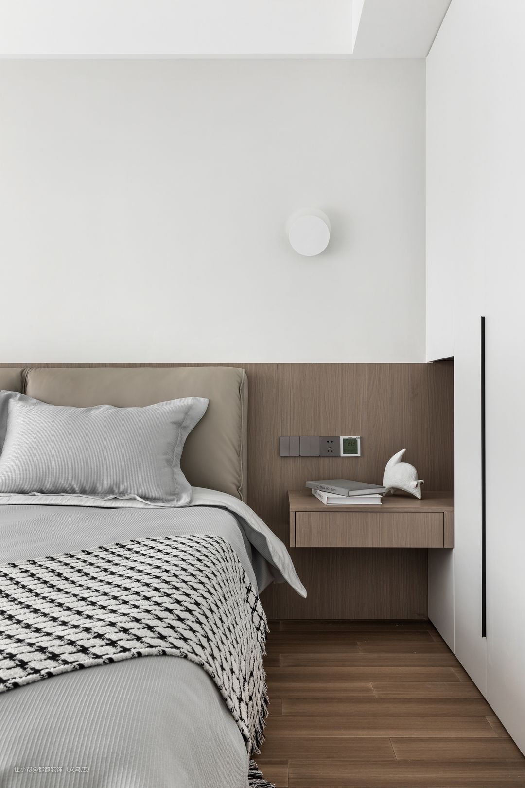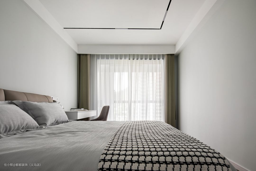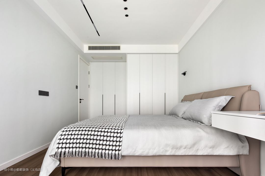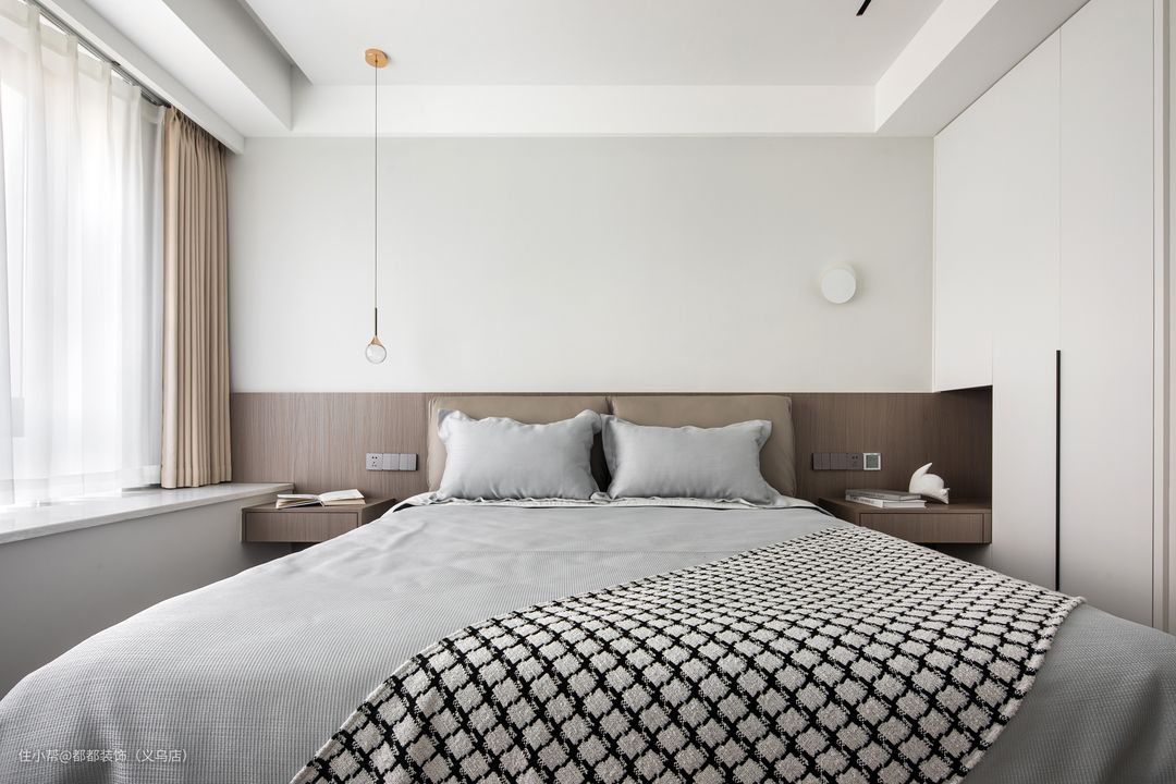 床为浅灰色四件套,海绵靠包,衣柜床头柜穿插一体,设计感十足 方便扫地机打扫,可以是床头柜或书桌,美观兼实用。可增加台面面积,整体性更强,更有造型感~