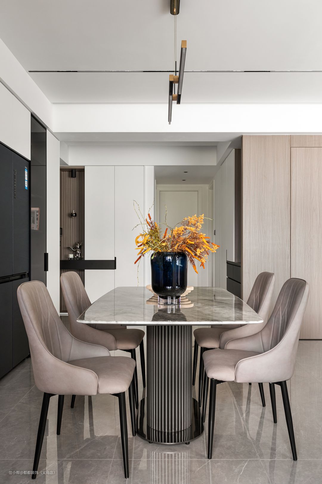 厨房空间比较小,考虑冰箱放到餐厅,利用深浅柜体将冰箱内嵌,和旁边的柜子为一体,既美观又整洁!