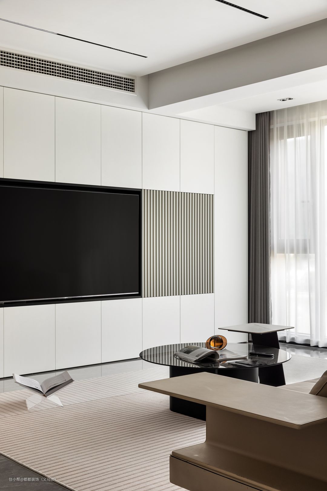 电视背景墙为嵌入式不锈钢电视壁龛,满焊一体式工艺,无焊点无拼缝,(不反光、抗指纹、好打理),高级感满满哦,收纳有序的同时使空间更加宽敞。 纳帕真皮米白色沙发,皮质柔软细腻,拥有良好的耐磨透气性能,妙不可言的回弹体验,在每一次的坐立间,立马便能恢复饱满造型。值得一提的是它的一体化沙发小边几,可收纳书籍、日常置物所需,随手拿放也是十分方便的。 极简组合茶几,兼顾设计和美感,可拆分自由组合,使得空间翻倍。高低组合错落有致,享受空间所带来的层次之美。