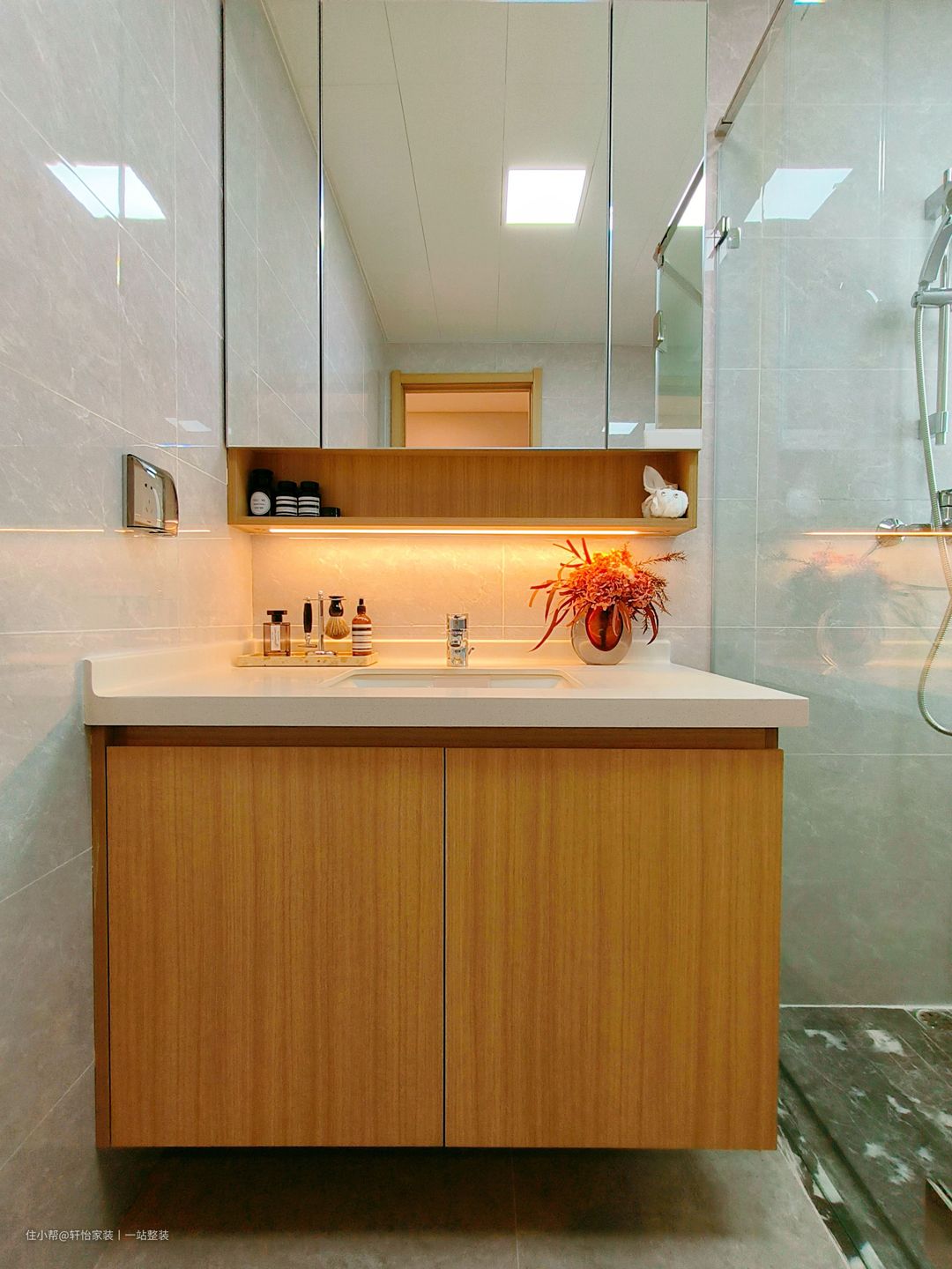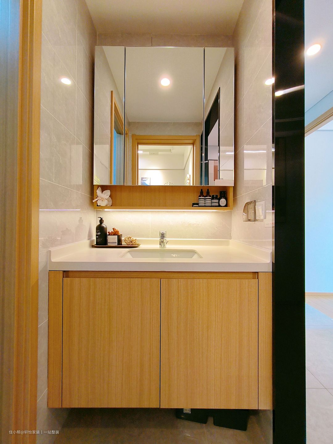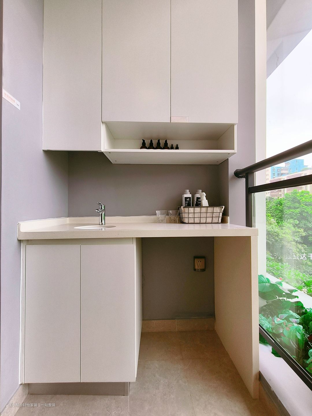 本期案例的居室有着宽敞的阳台空间,靠墙的角落做了洗手池+储物柜一体化设计,颜色搭配和谐统一。大容量储物设计,物品摆放井然有序,合理的利用更节省空间。