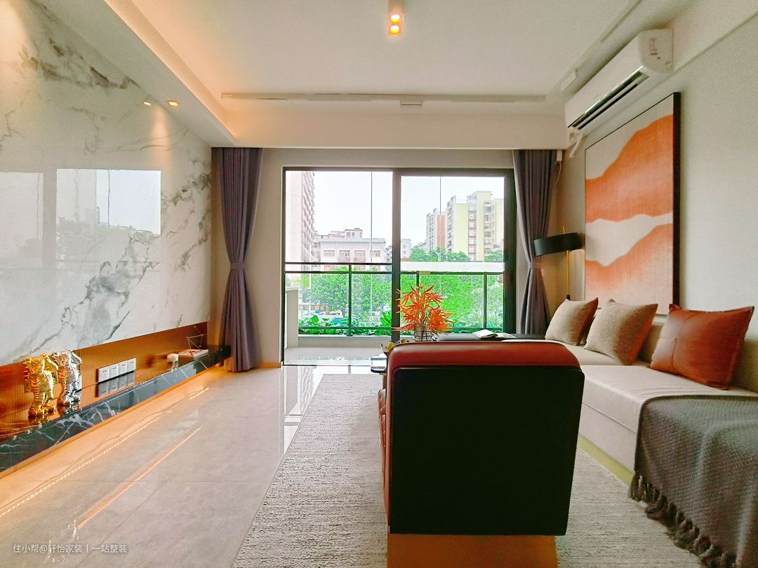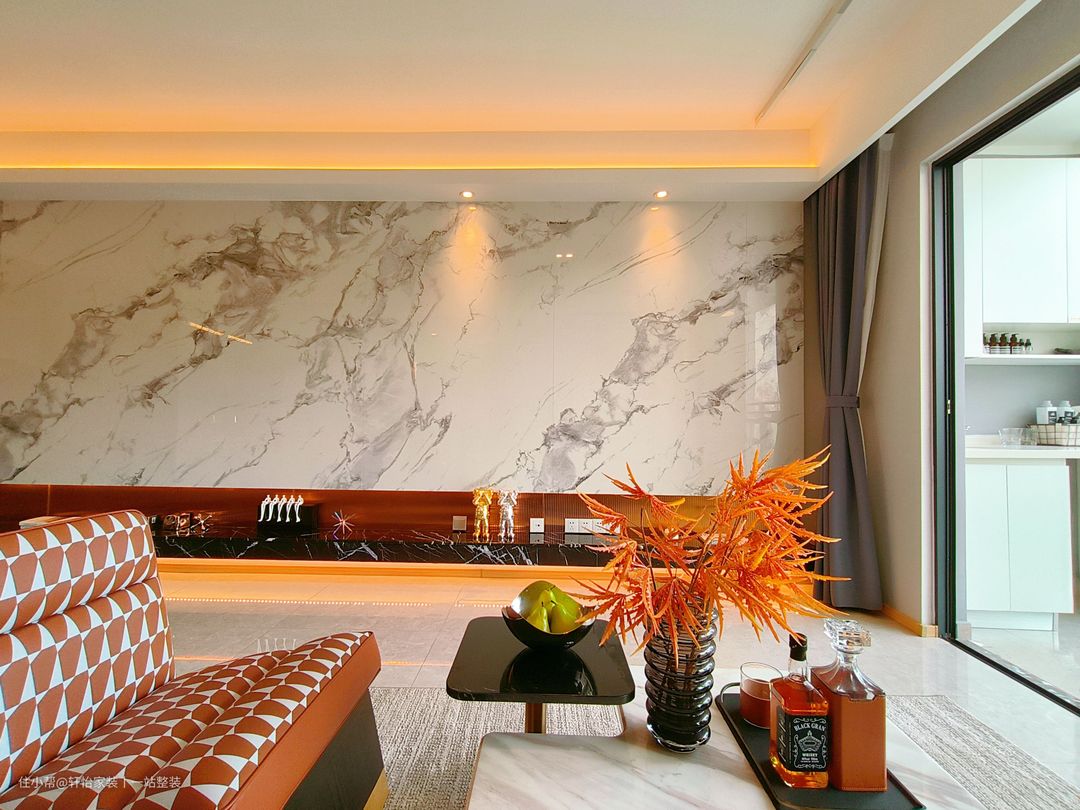 一张长形白色皮质沙发与深棕色的贵妃椅和爱马仕橙的单人椅组合成围合布局,同时分别在沙发两边和中间都安置了边几和茶几,不仅能有效促进家庭氛围的融合,还更加方便业主平日里招待客人,为业主打造了一个社交互动性的家庭场所,温馨感十足,与沙发背后的整面开放格收纳柜相衬,形成空间视觉的开阔感,为客厅软点缀增添了光彩。 去电视化设计,让客厅看起来更加大气轻盈,一整面花纹岩板背景墙与地柜组合设计,既有天然壁画的空间视觉,还满足了业主的空间展示美化的效果。 客厅的装修十分简洁,采光十分富足,大面积的铝合封窗,搭配客厅的辅灯照明,不仅满足了客厅的功能采光,还满足了阅读区的采光和视野。