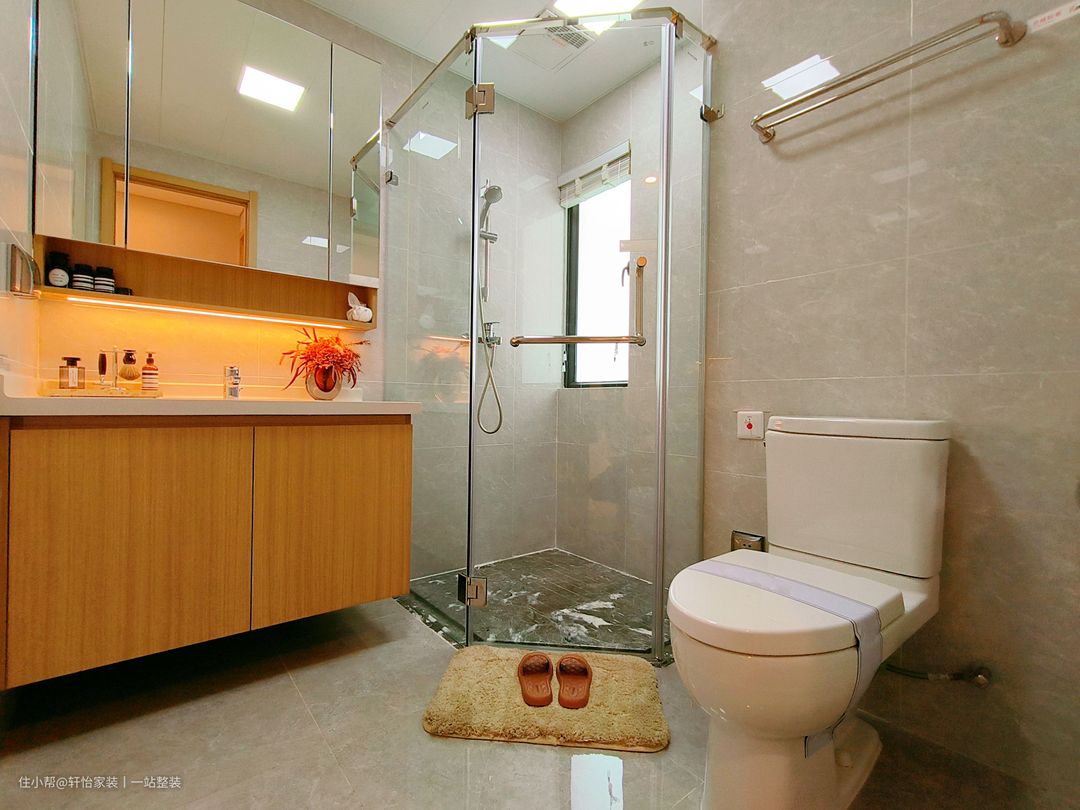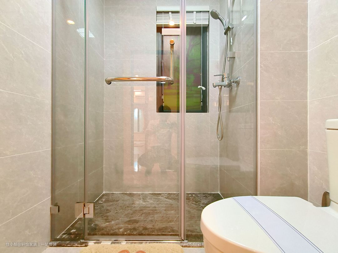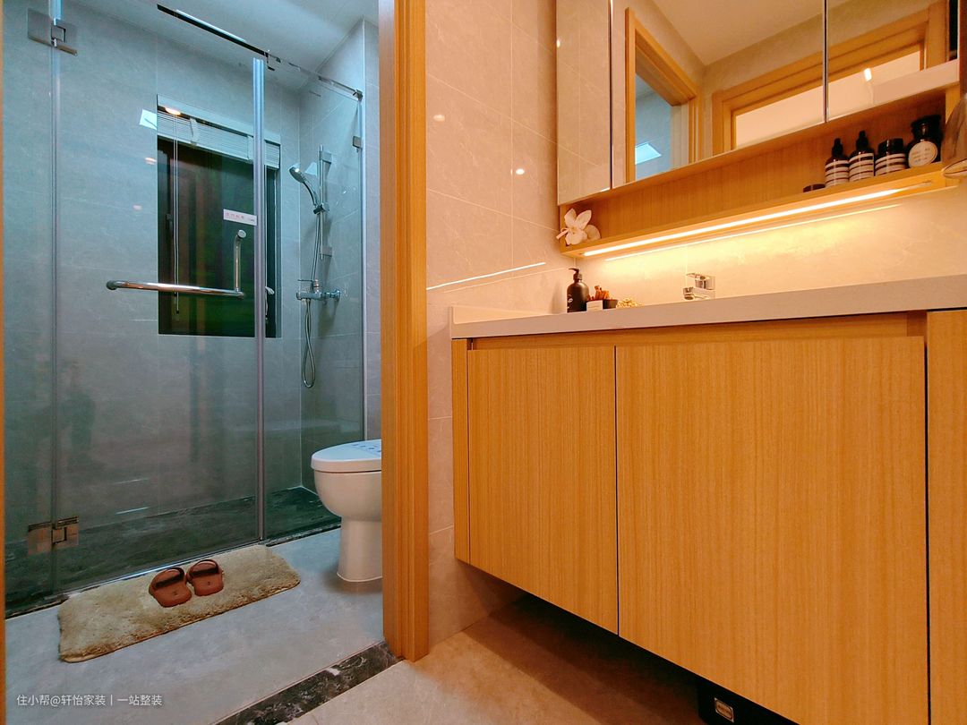 主卫采用流行的干湿分离设计,墙体通铺白色花纹大理石瓷砖,搭配透明玻璃门,保温防水防盗功能更显著。铺贴白色瓷砖的洗手台,底下添置了隔板收纳,日常用品有了收纳空间,让卫浴空间更加干净整洁。坐厕上放安置不锈钢多功能挂物架,方便日常洗漱用品收纳。 卫生间在瓷砖选择上采用了白净的色彩,白净的颜色使得卫生间在视觉上显得通透明亮。本期主卫生间整体空间布局错落有致,淋浴的区域以环绕的透明玻璃门隔开,有效防止水滴外溅,保持空间上的干爽。而如厕以及洗漱的位置围绕淋浴区而置,空间虽小,但显大气。 加宽台面设计的洗漱台,用作收纳日用品,非常便捷实用。其次镜面柜+收纳柜组合收纳,让宝妈无惧日常用品无地可放的处境。