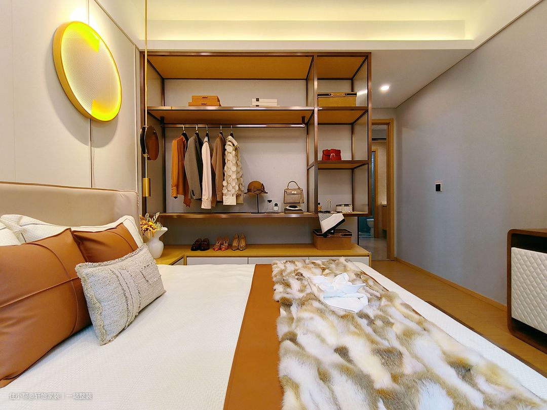 入门便感受到内敛低调的清雅氛围,白色的床卧搭配橘色的抱枕,床品是棕色花纹的图案,床头左侧是奶白色的床头柜,另一边是床头柜和收纳柜的一体化设计,方便户主拿取物品,床头墙壁安置设计金色的环状吊灯,暖黄色的光晕让空间更显温柔,窗外的风吹起白色的窗纱,映衬着灰色的窗帘,一切都那么的舒适自在! 最里侧则是开设一扇小飘窗,窗台上布置毛毯、小抱枕,方便闲暇之余坐在飘窗处思考人生。 追求简约风格的人希望在休息的时间更是全身心的放松,简洁的家具和明快的色调设计都是卧室的风格设计。全实木要打造的柚木地板,安全又健康。衣帽间,收纳柜的组合,开放式的设计,有条不紊的归置了衣服等物品,充分满足衣物收纳需求。