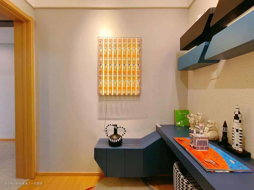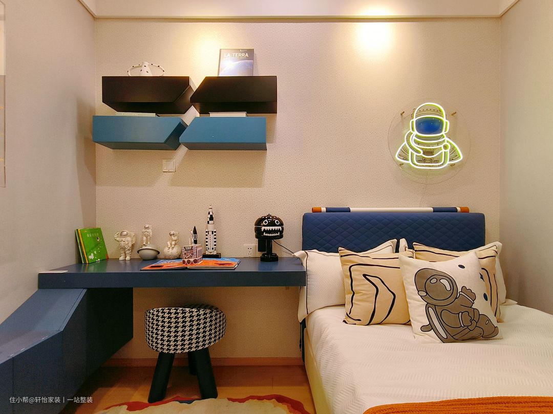 白色的背景下,左边设置蓝色的书桌,满足孩子学习与阅读的需求,床上的卡通抱枕散发着童趣。 根据业主的实际居住需求,设计师将儿童房进行了主题设计,主要色调式小男孩喜欢的深蓝色。简洁明快,活泼新鲜的色彩,富有童话式的意境,能够让孩子尽情的散发自我的创造力。 房间多出细节使用主题元素,床头“宇宙空间”设计、宇航员摆件等等,都是充满孩子般的幻想的元素,平添了很多生活的乐趣!