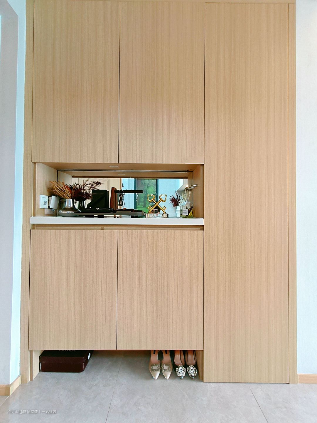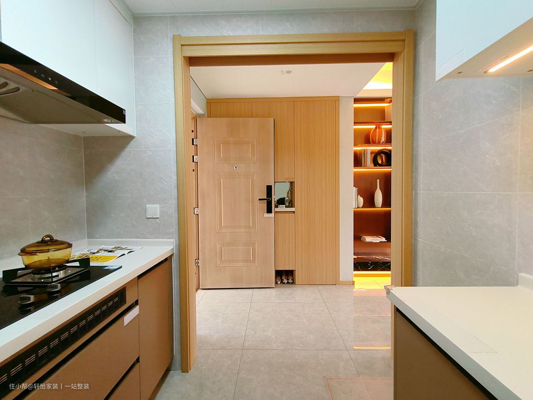 玄关设计加高超大容量玄关柜,巧用领域,打造舒适生活空间,过道处的整面盲盒收纳柜不要太惊艳啦~胡桃色柜体打造治愈玄关氛围,打破纯色的呆板和视觉疲劳,让细节更耐看更精致。彰显高雅大气的格调,兼具实用功能和美学设计规整不沉闷,甄选实木多层板健康环保使用更放心,承载“满仓惊喜”生活感的完美融合。中间开放式的设计可以让户主随心摆放进门前的手机、包包钥匙等物品,大容量开放储物满足你的小懒惰。