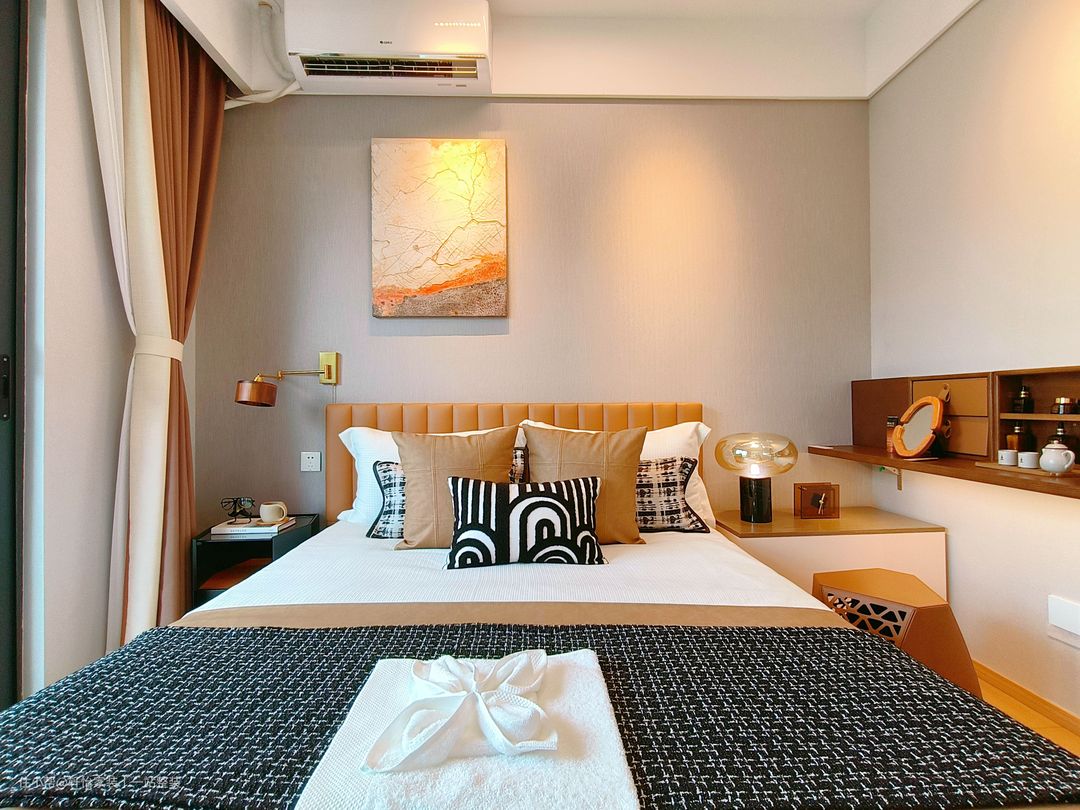 次卧整体空间是比较温馨的,不追求花里胡哨,只想要简单的感觉。 黑白花纹的抱枕,高弹蓬松枕芯,用芯享受,柔软舒适。素净的大床搭配千鸟格搭巾,亲肤舒适,毯面平整,3D印染技术,不掉毛不褪色,手工包边,细致缝纫。极简大床,线条干净,造型圆润,用丝绒的质感中和空间硬朗,构筑一方安宁天地。 右侧璧挂式吊柜,墙面的空间得以利用,省出通畅的地面。除了柜子内部,顶面也可以放置各种物品,能在不顶部占用地面面积的情况下,收获不少的置物空间。开放式储物格。圆润边角的细腻处理,精心打磨钝化,舒适的手感能够保护家中小孩的安全。