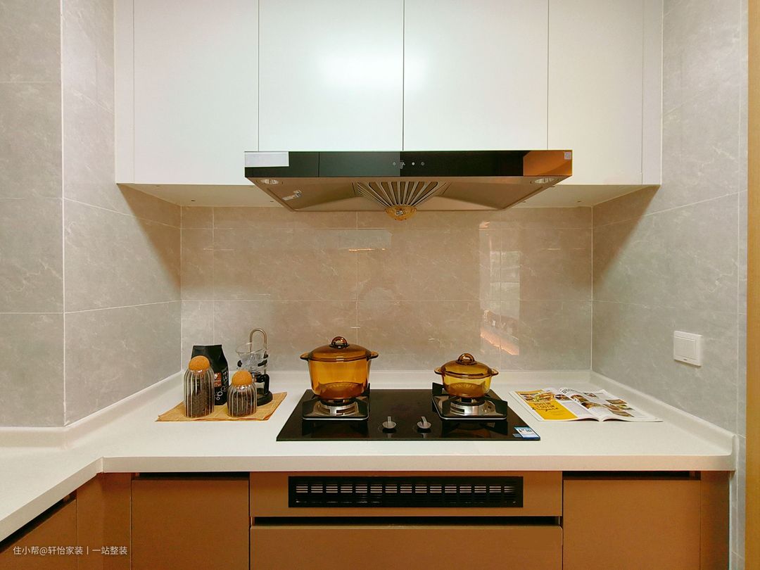 厨房在布局上采用U型的设计方式,色彩上采用了原木与橘色,让人眼前一亮,整体视觉上显通透明亮。奶白色的橱柜围绕案台上下方镶嵌,整体增加了厨房的收纳容量。 双灶台的设置,让烹饪变得更加高效和便捷。墙上收纳吊柜的设计,收纳瓶瓶罐罐调料十分实用。