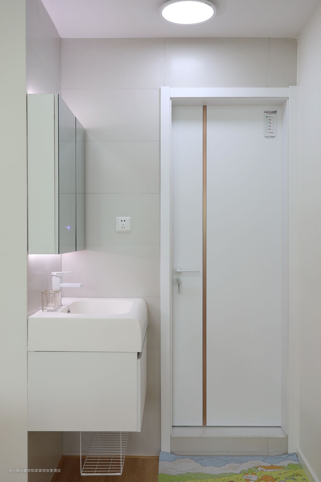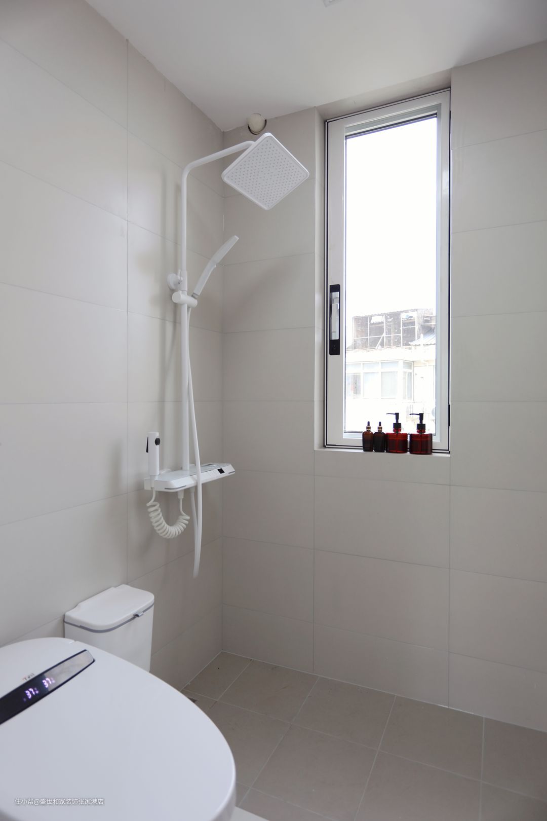 1 卫生间做干湿分离,将干区独立于卫生间外,因为老房型本身没有做下沉设计,因此设计师将卫生间内部地面整体抬高。 2 马桶选用智能马桶,隐藏式水箱更能节约卫生间空间。 3 淋浴区地面做坡度更利于下水,利用浴帘隔开,也就没有玻璃隔断产生的积水问题。