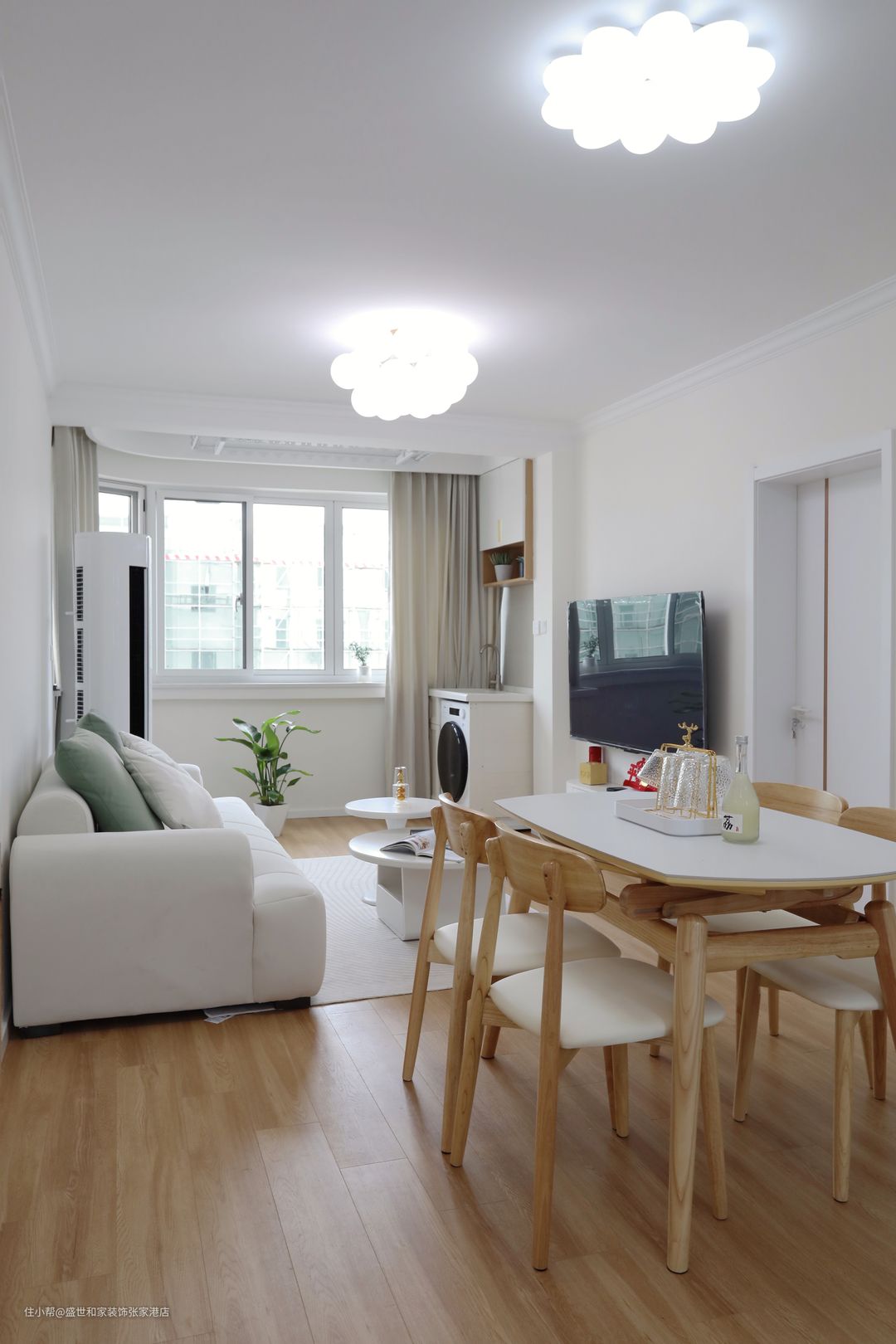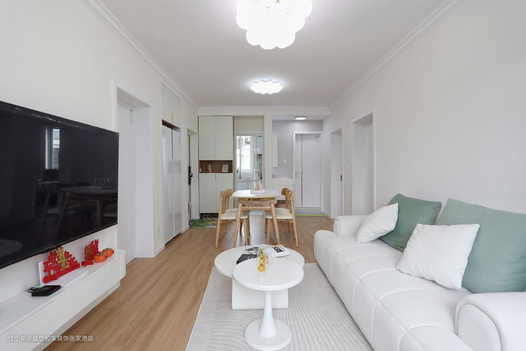 1 整体户型为三室一厅,留给外部的活动空间不大,因此客餐厅一体是最合适的设计。 2 地面通铺木地板,阳台也被纳入室内空间,增加视觉面积。 3 整体墙面留白,简约的设计与色调,搭配单色软装,看起来舒适慵懒。 4 不过度使用杂乱的颜色,会让整体空间看起来更加干净清爽,布局上也会显得十分有序。