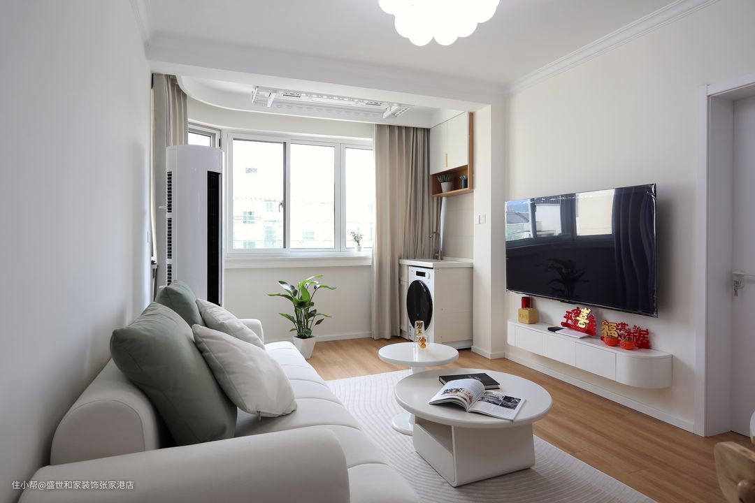 1 阳台空间的宽度与客厅整体一致,在保留原有的自然采光的情况下,增加洗衣晾晒功能。