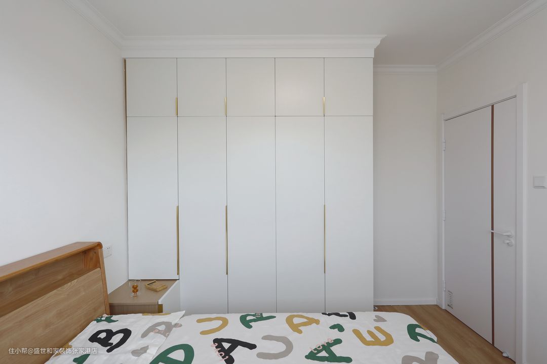 1 男孩房以简约为主,保留着最基础的卧室功能。 2 整墙衣柜的设计能够合理的使用空间的立面区域,小空间也不会显得那么局促。 3 一侧床头柜与定制衣柜一体,丰富空间功能,床头开放格可以放置小玩偶陪伴孩子入睡。