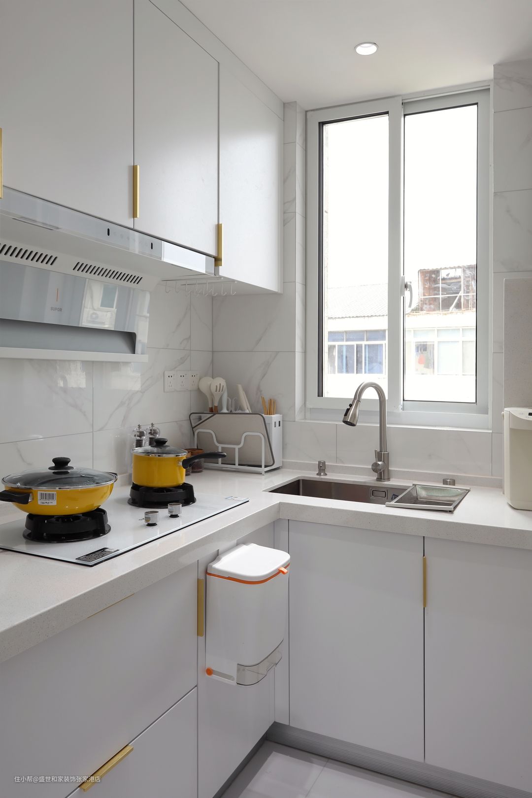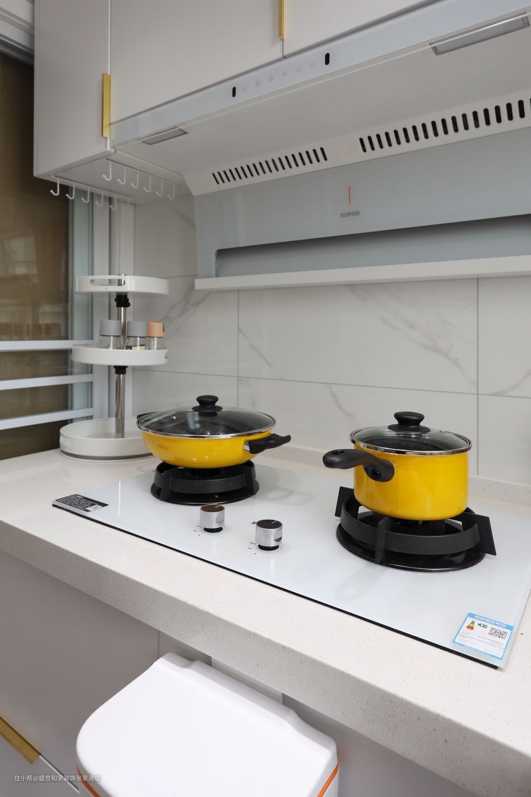 1 厨房空间则是根据原户型的能用空间以及业主的动线需求,做L型厨柜。 2 定制吊柜与烟机高度一致,足够的收纳,使台面整洁干净。