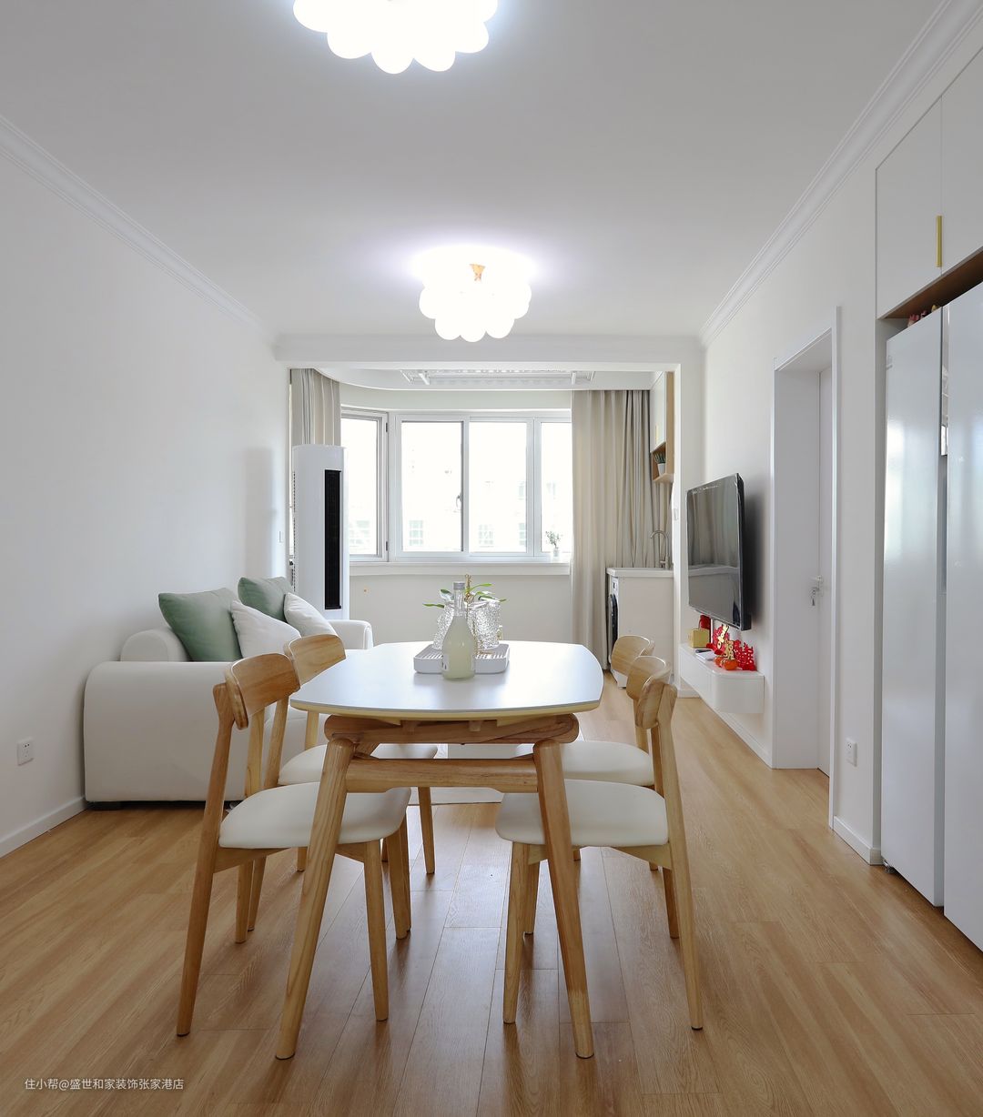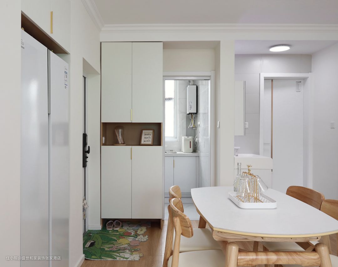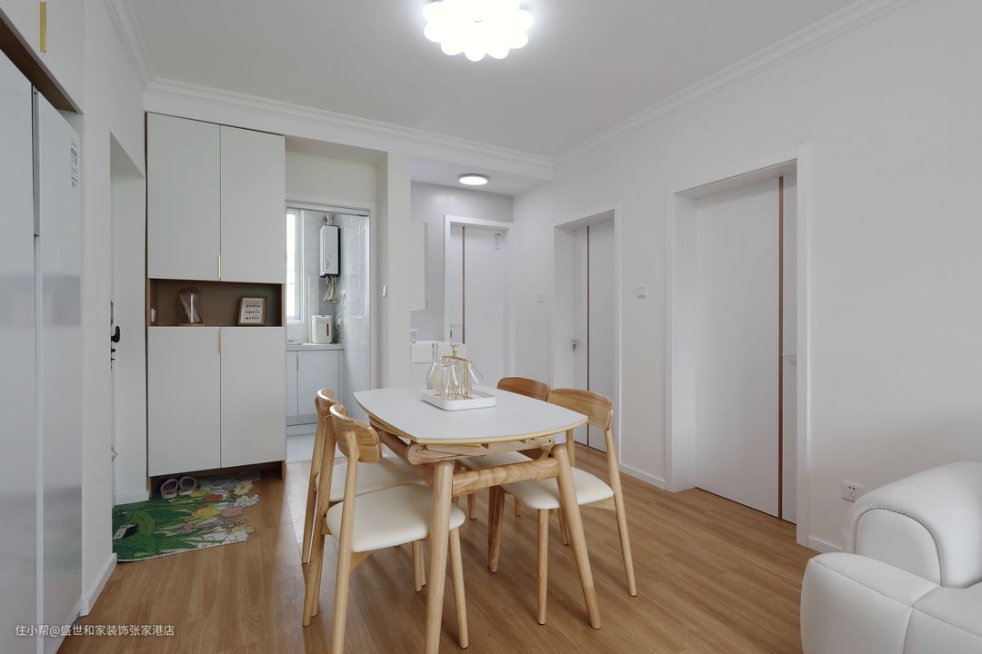 1 餐厅空间的边界比较模糊,位于入户一侧的冰箱前,合理利用了小户型空间。 2 餐桌与整体一致使用木质材料,辅以白色的色调,给人明亮的感觉。 3 设计师在空间中,有意识的将空间统一,追求简洁的空间美学。