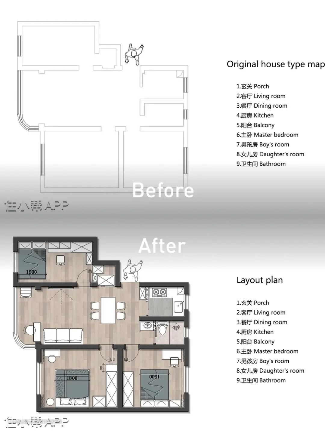改造后的户型没有做太大的改动,进门借用原有的厨房空间,做玄关柜,原本朝南女儿房的角落空间与客厅打通,定制宽度嵌入双开门冰箱,另一侧则为女儿房做定制柜,因为是一家四口居住,所以卫生间一定要做干湿分离,设计师将原始的卫生间墙面拆改,做干湿三分离,更便于日常使用。而每个空间增加的定制通顶柜,则是让空间利用率得到有效的提升。